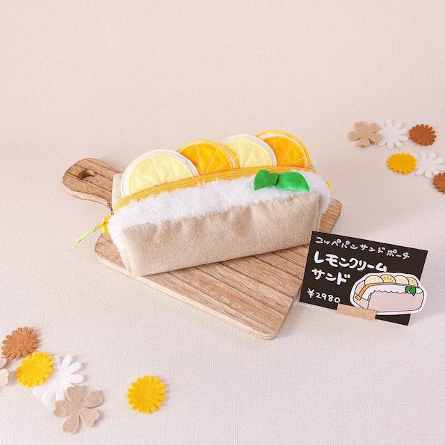 もちもちした白生地のふんわり白コッペパンにふわふわのホイップクリームをしぼり、 2種の新鮮なスライスレモン、 ミントを添えて、 真ん中にはレモンカスタードをたっぷり挟みました。 柑橘とクリームを組み合わせた、爽やかなレモンクリームサンドです。 まるで本物のコッペパンサンドのような、思わず食べてしまいそうになるポーチです 色々な小物を入れるポーチとして、 ペンや文房具を入れるペンケースとして、 メイクブラシや化粧品を入れるメイクポーチとしても、 様々な用途にお使いいただけます。 学校や職場に持って行って、みんなの注目の的になること間違いなしです! パンやサンドイッチが好きな人へのプレゼントとしても、いかがですか? 内側はファスナーの色に合わせて、黄色になっています。 ちこのロゴ入りのポケットも付いていて、散らかりがちな細かい物も、このポケットに入れるとスッキリして、とても便利です! 生地の間にキルト芯(綿)が入っているので、ふわふわとした触り心地になっております。 *サイズ横16cm、縦6cm、幅6cm *お洗濯の際は手洗いをおすすめいたします *具材を無理に引っ張らないでください。縫製が外れる場合がございます。丁寧に扱っていただけると嬉しいです。 *全て一つ一つ愛情込めて、丁寧に手作りしております。お買い上げいただいたお客様に喜んでいただけることを、心より願っております