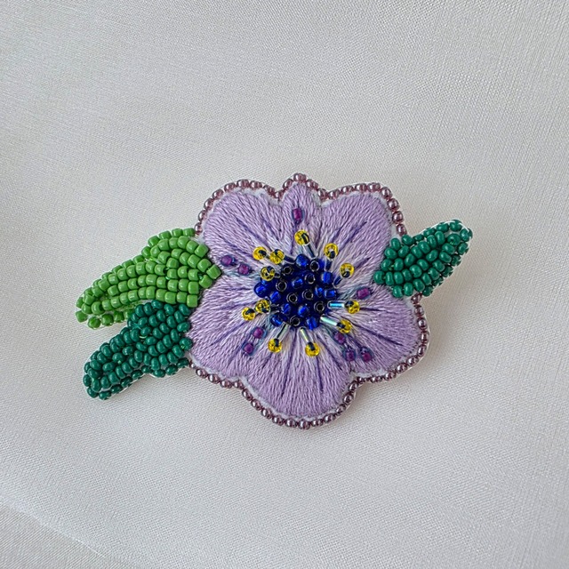 薄紫色のグラデーションと中心の紺色部分やビーズで作った葉が印象的なお花のブローチです。 フェルト、ビーズ、刺繍糸を使用。 側面もブリックステッチで丁寧に仕上げていま す。 縦約4cm、横約7cm (1番長い部分) ビーズ刺繍は繊細です、丁寧にお取り扱いくだ さい。刺繍部分の引っかけにはご注意くださ い。