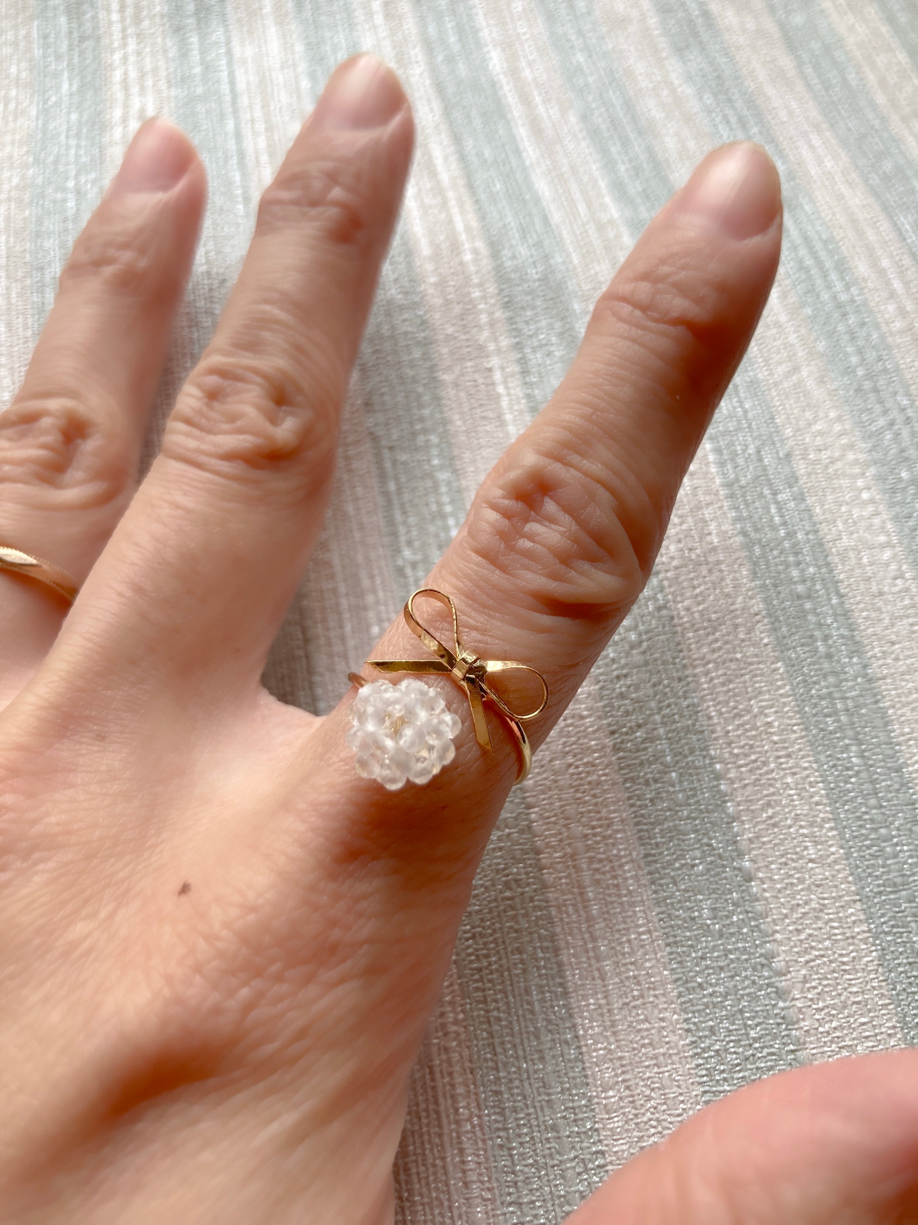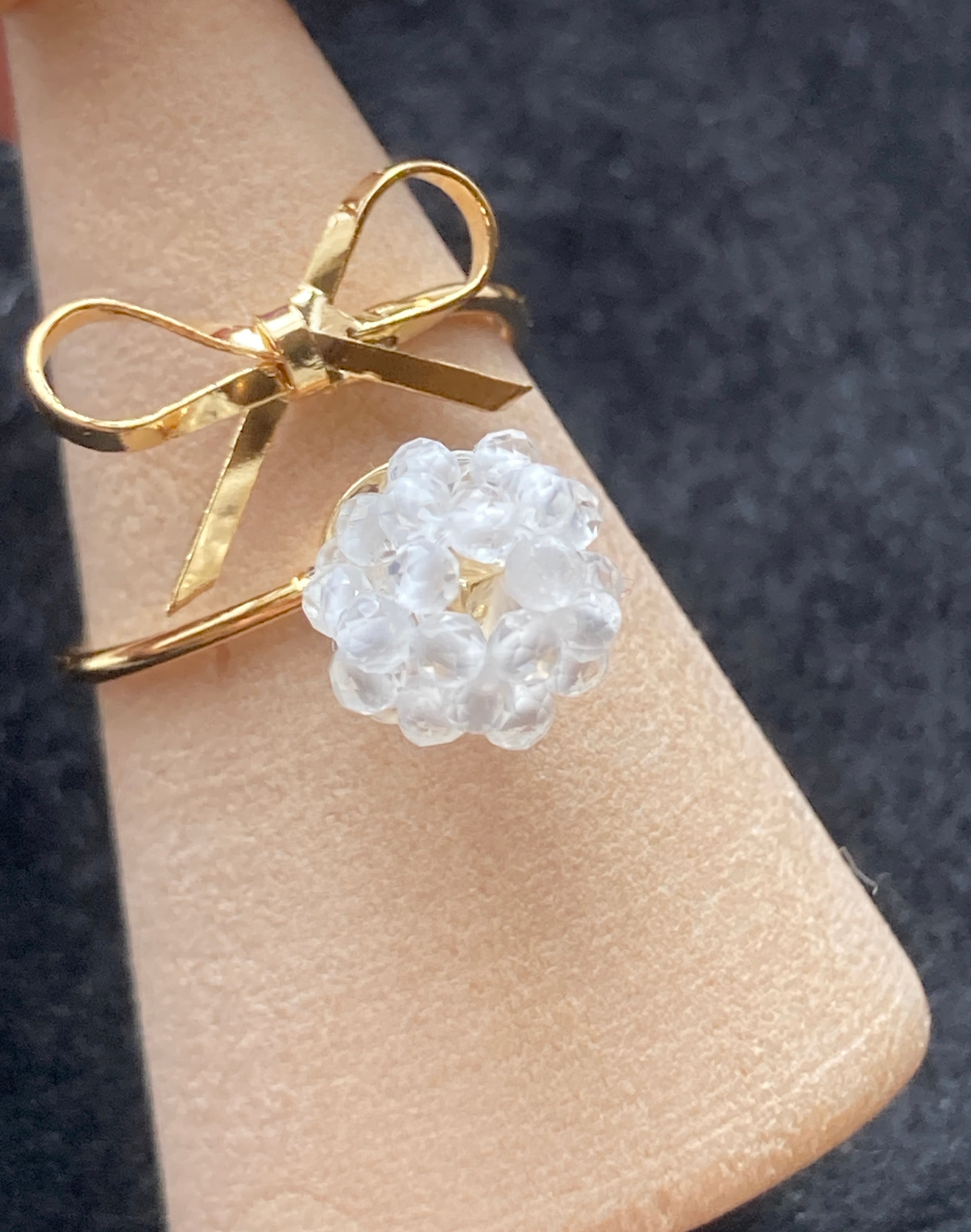 2ミリの水晶ビーズで作成した指輪です。キラキラのカットが入っていますがコーティングはなく水晶本来の質感を楽しんでいただけます。繊細な輝きで見ているだけで癒されます。どんな色の服にも合わせやすい指輪です。リボンモチーフもとても可愛いおススメの指輪です。サイズ調整可能なタイプの指輪で安心してお使いいただけます。