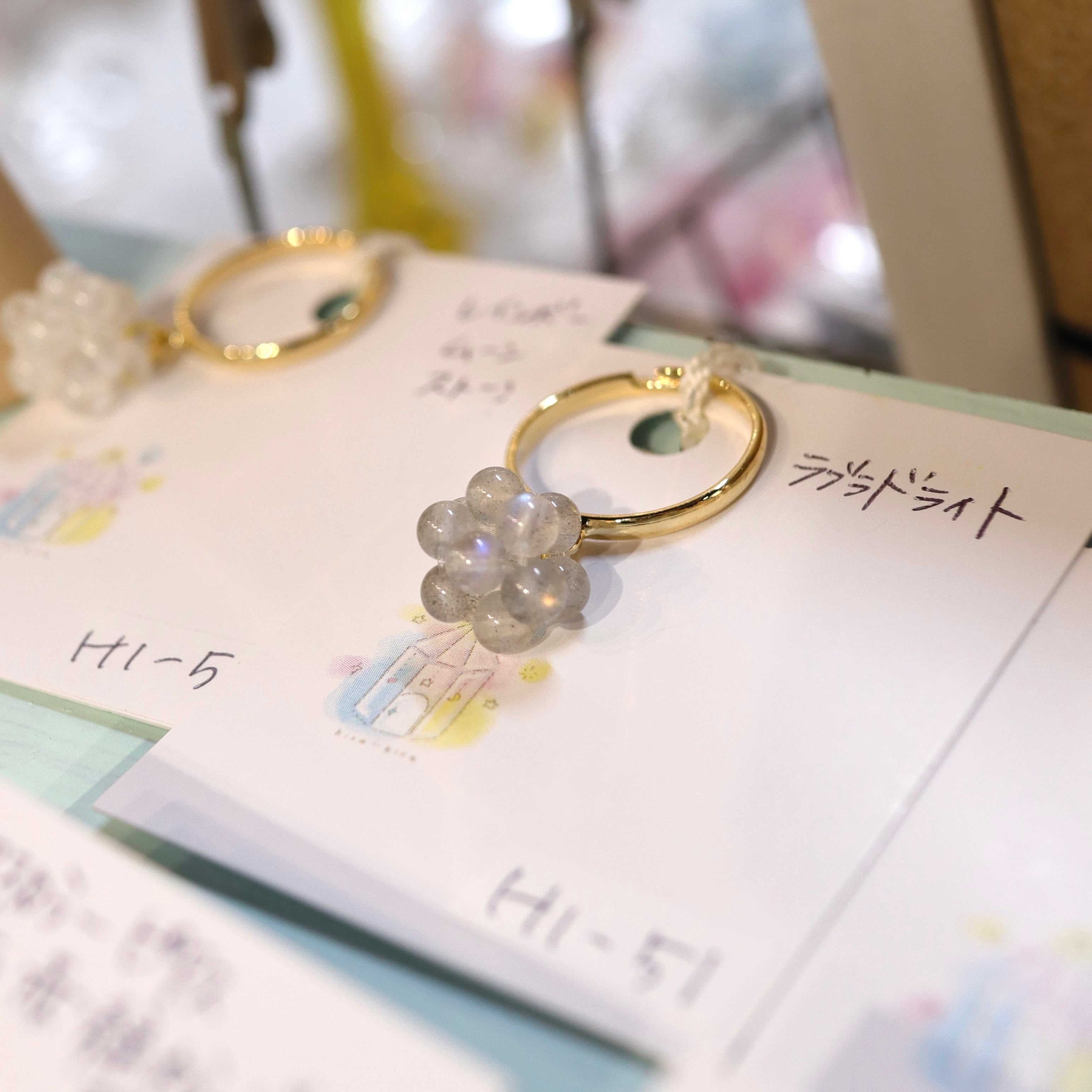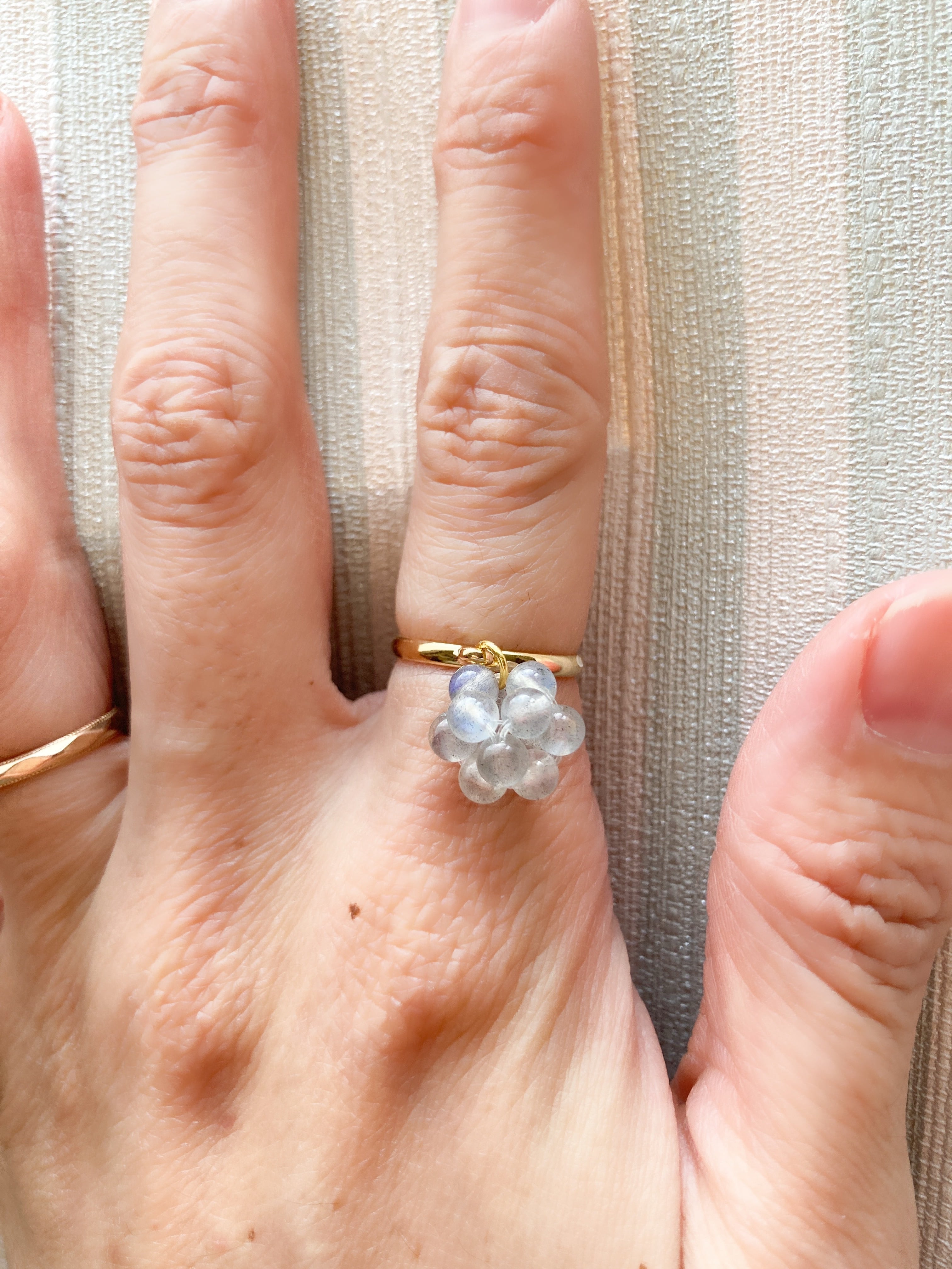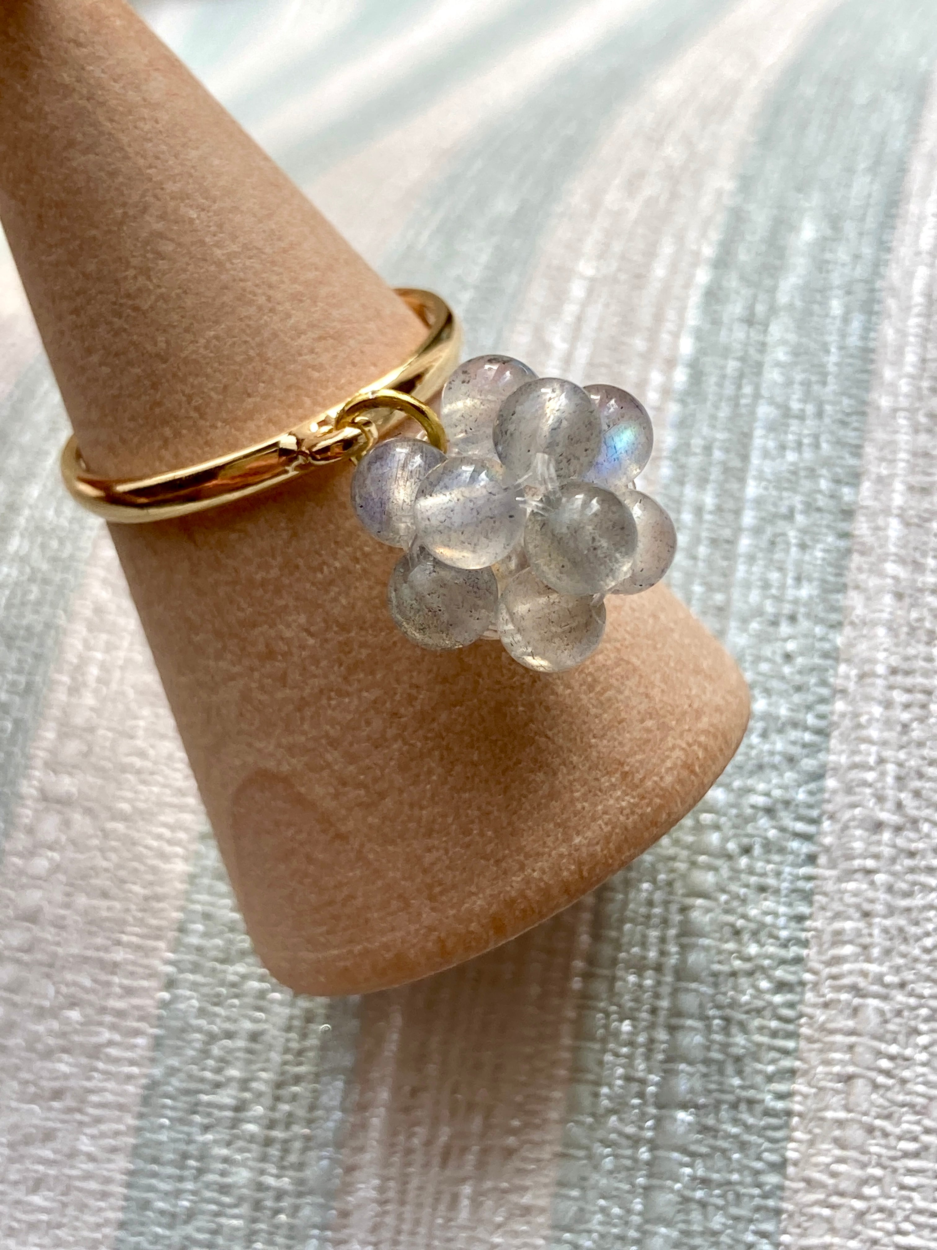 シラーが美しい4ミリの丸玉ラブラドライトで作成した指輪です。ラブラドライト特有のシラーに魅了されてずっと眺めていたい指輪を作りました。指輪にぶら下がるようにデザインされた天然石が手の動きに合わせてコロコロ動きいろんな角度から石を見ていただくことができます。本当に見ているだけで癒されます。指輪はサイズ調整可能なタイプで安心してお使いいただけます。