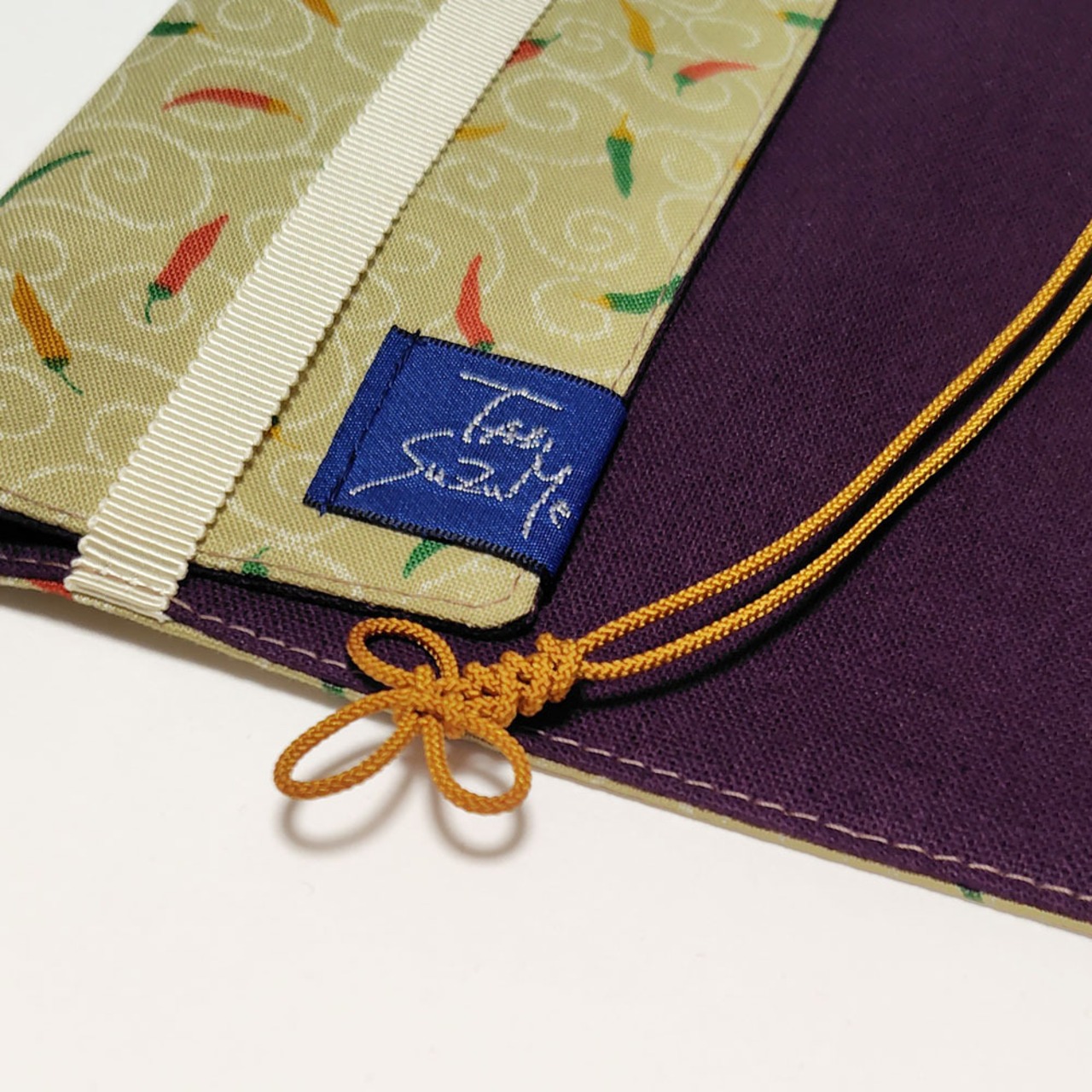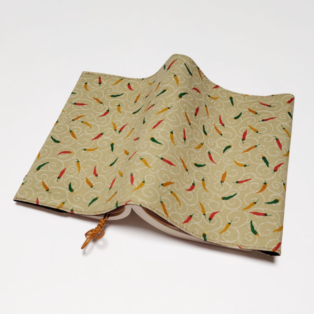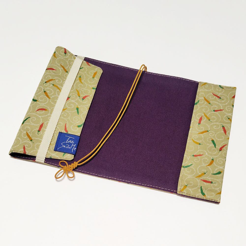 唐草模様と唐辛子の柄の文庫用サイズのブックカバーです。
