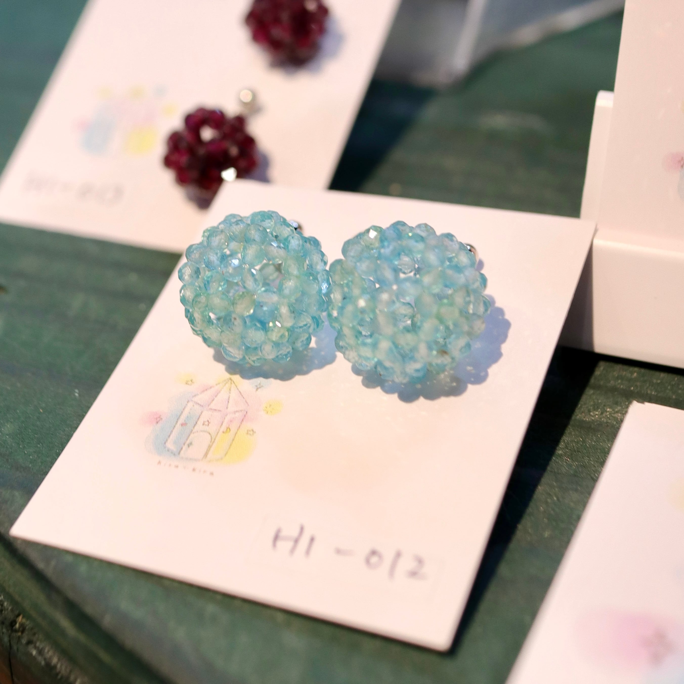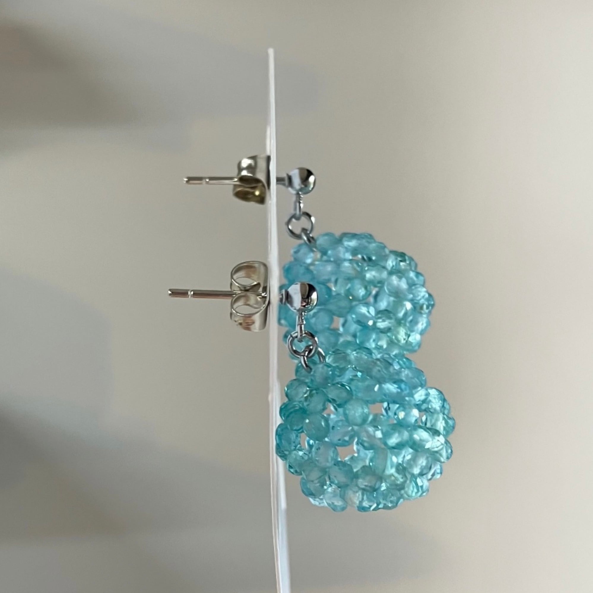 2ミリカットのアパタイトのビーズで作成した繊細なピアスです。ひとつの球体を作るのに90個のビーズを編み込んでおり手作業で一粒一粒ビーズを通しています。作成中はまさに動の瞑想状態でこの時間が好きなのです。
