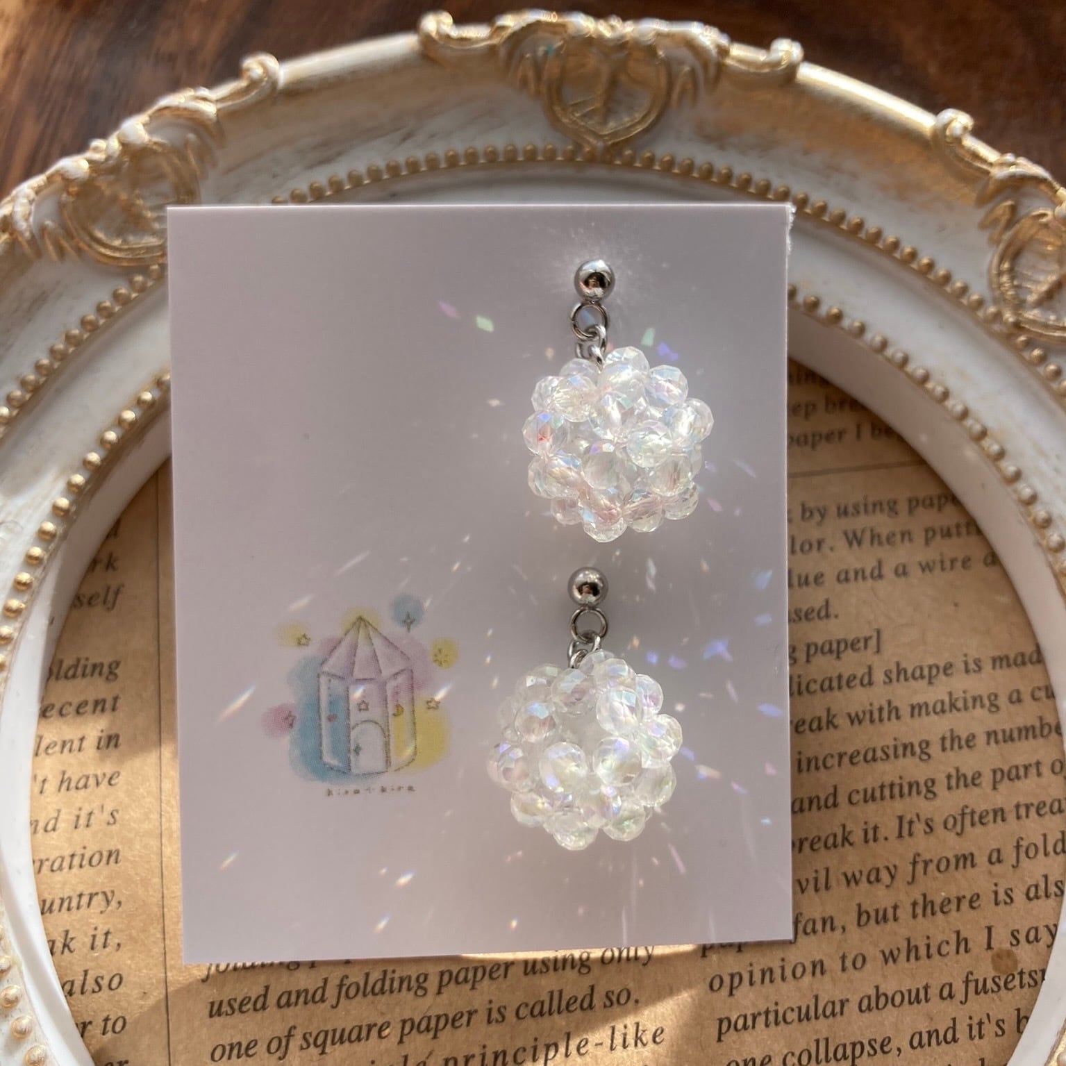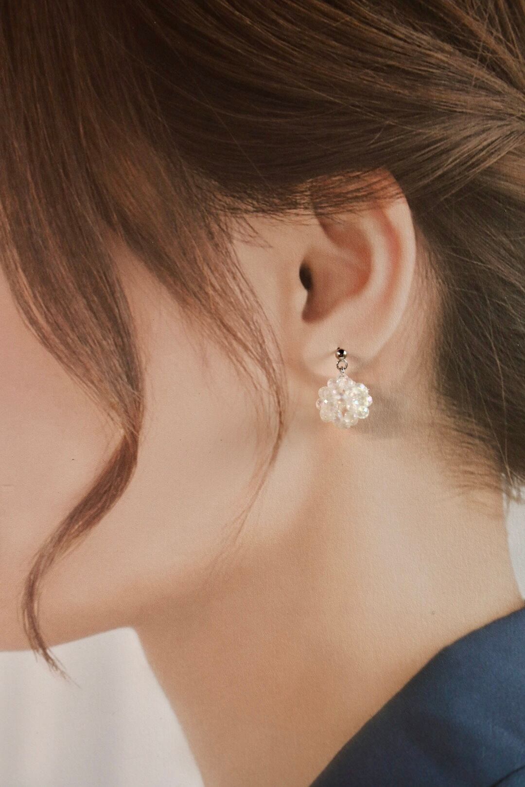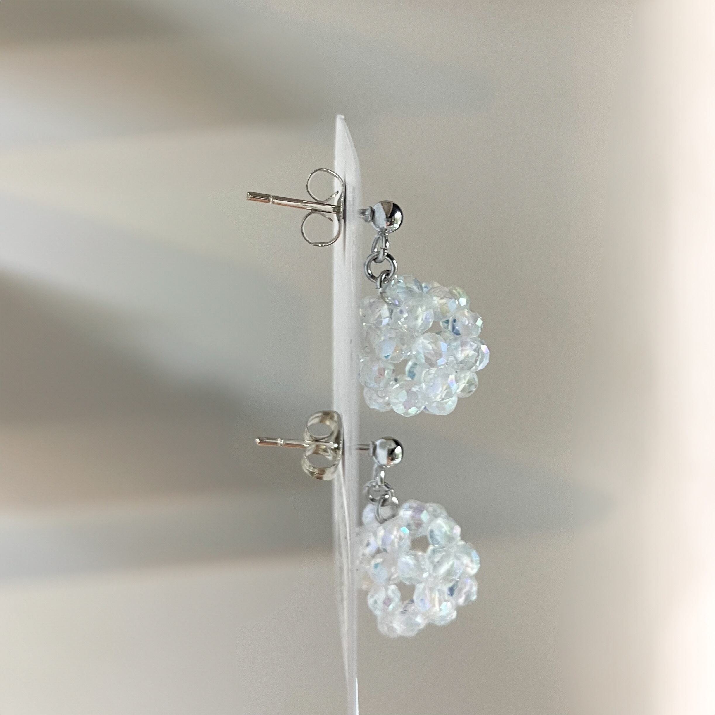 水晶の3ミリカットビーズ、表面が金属フィルムでキラキラコーティングされシャボン玉のように輝く可愛い石、アクアクリスタルのピアスです。