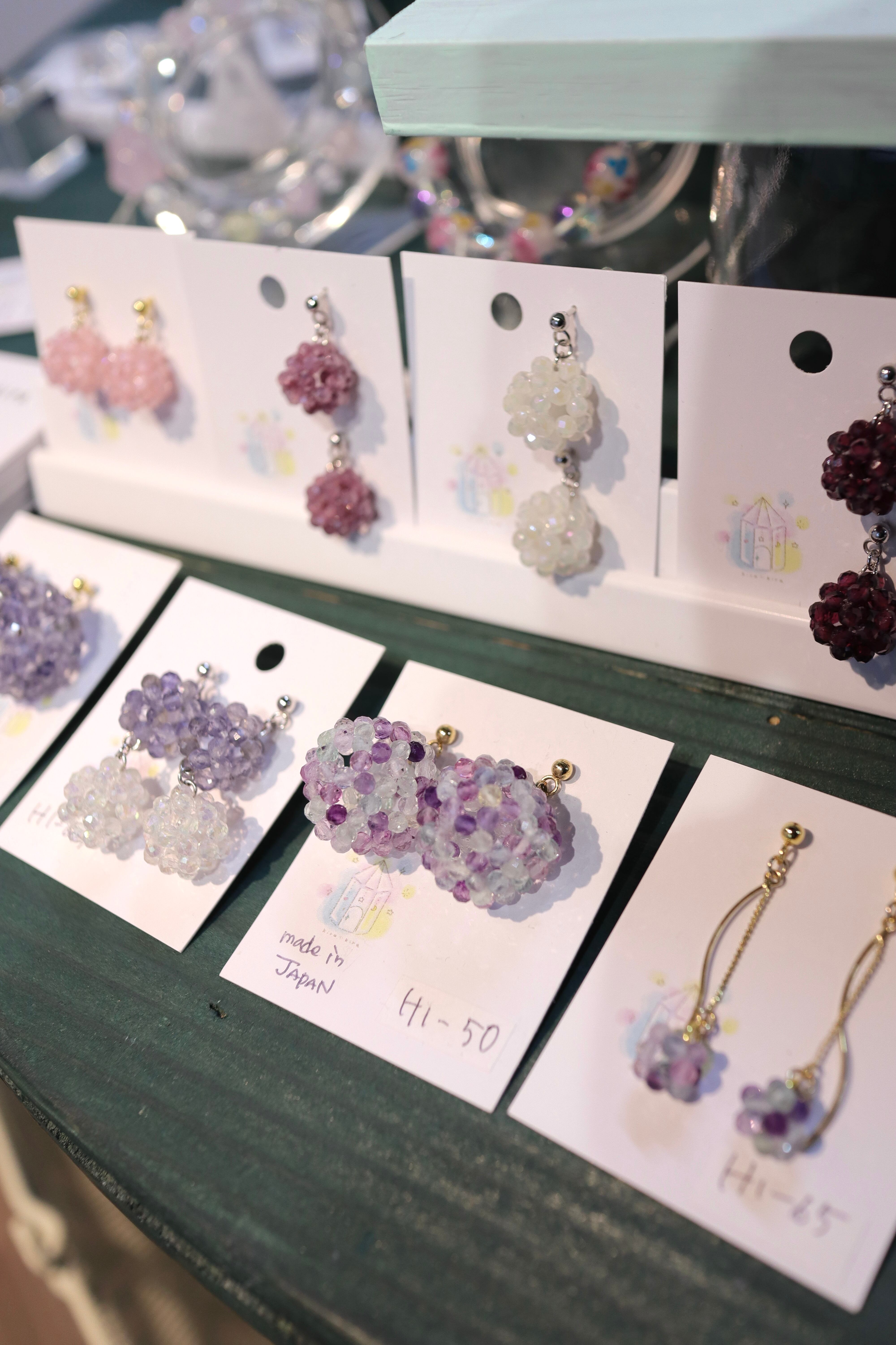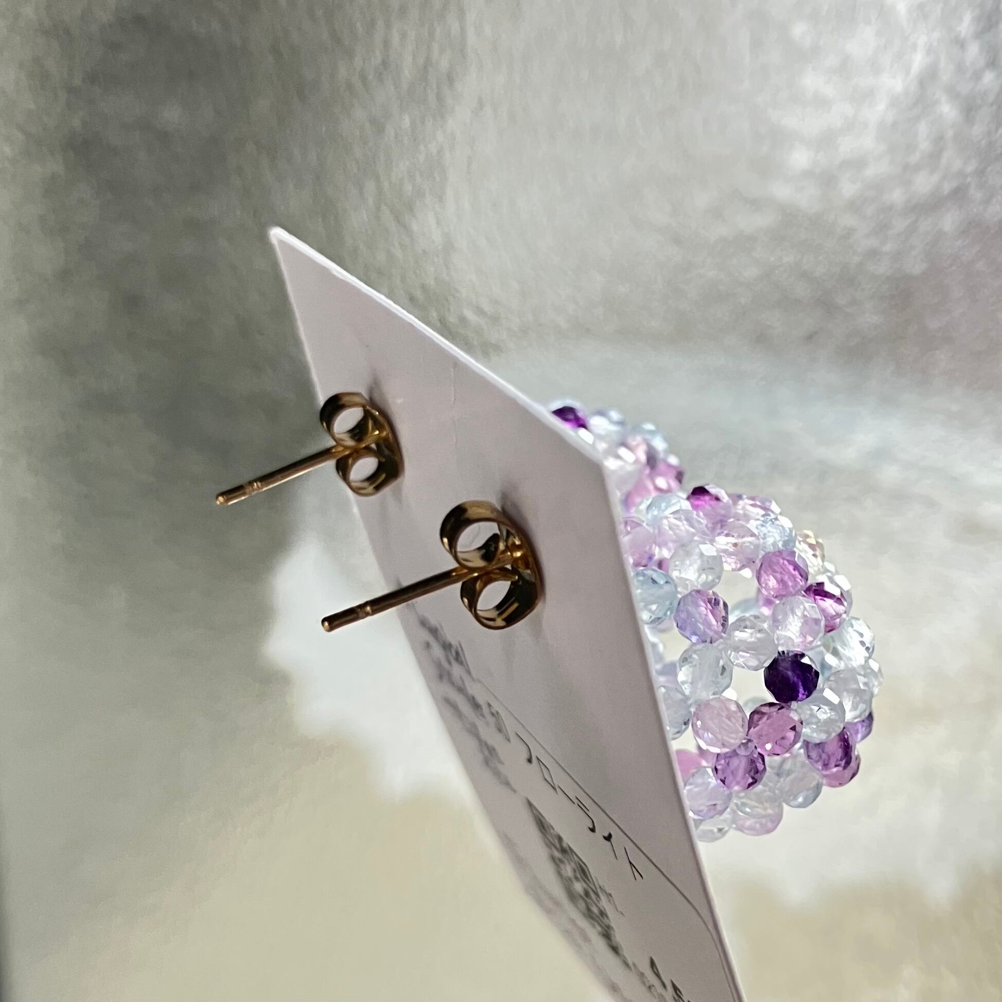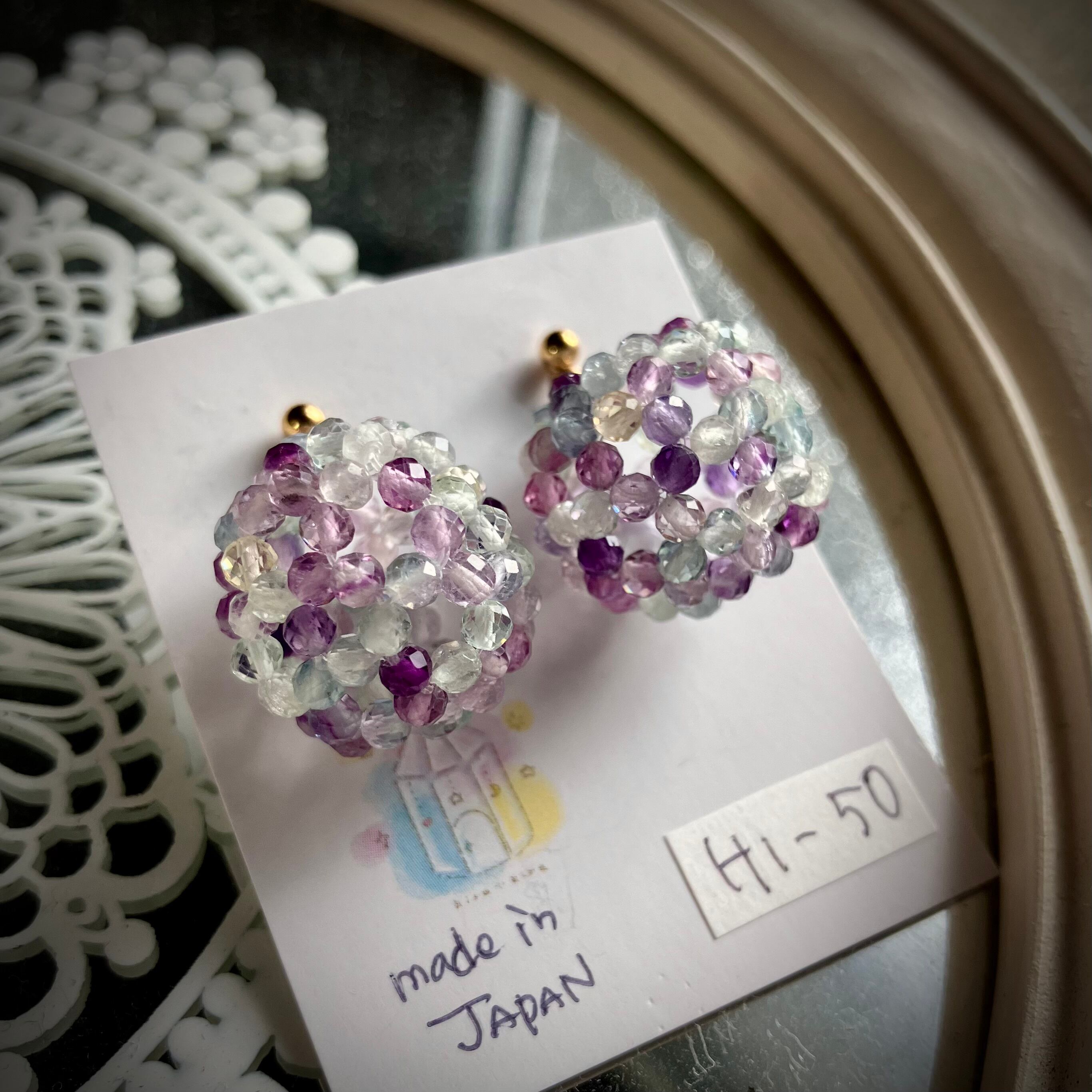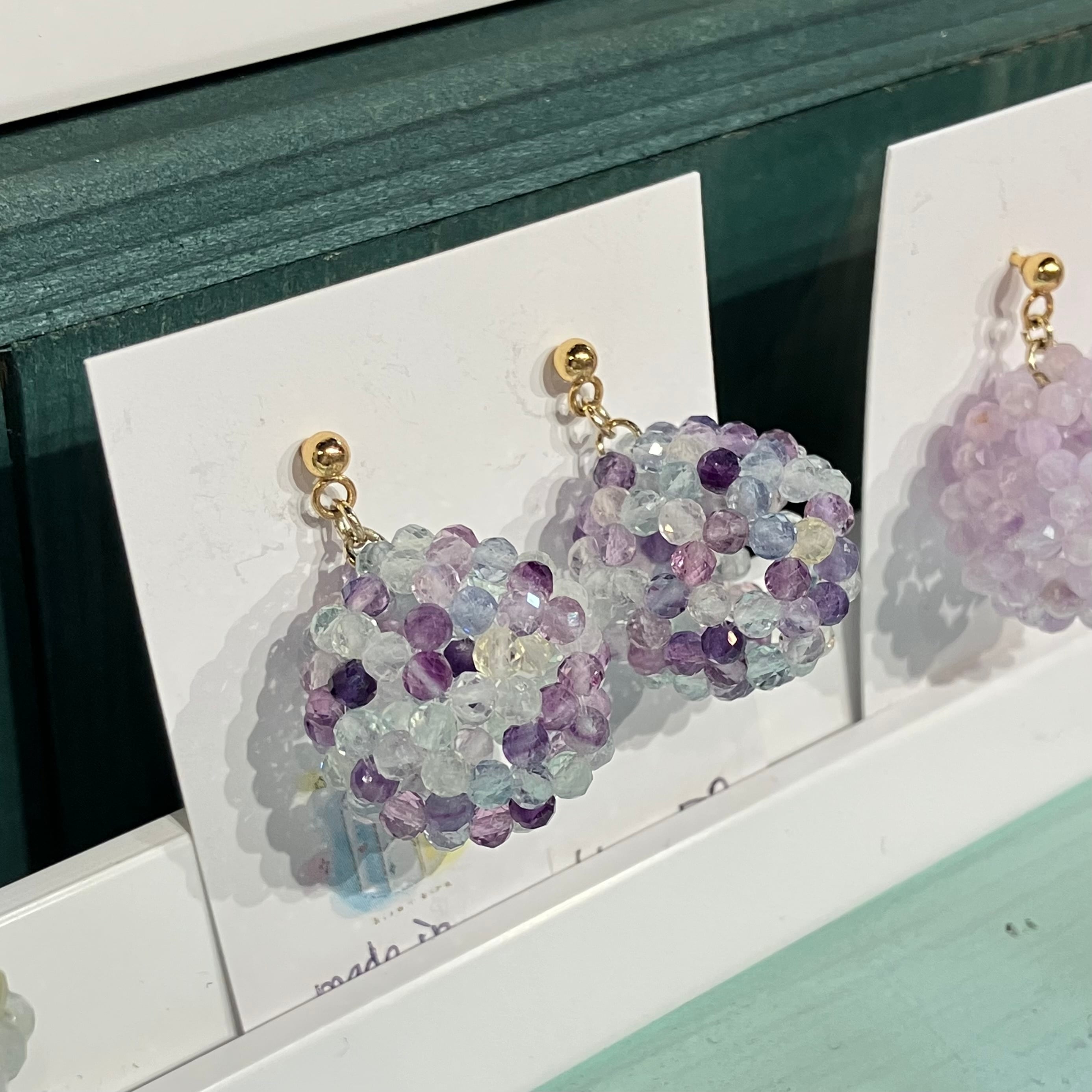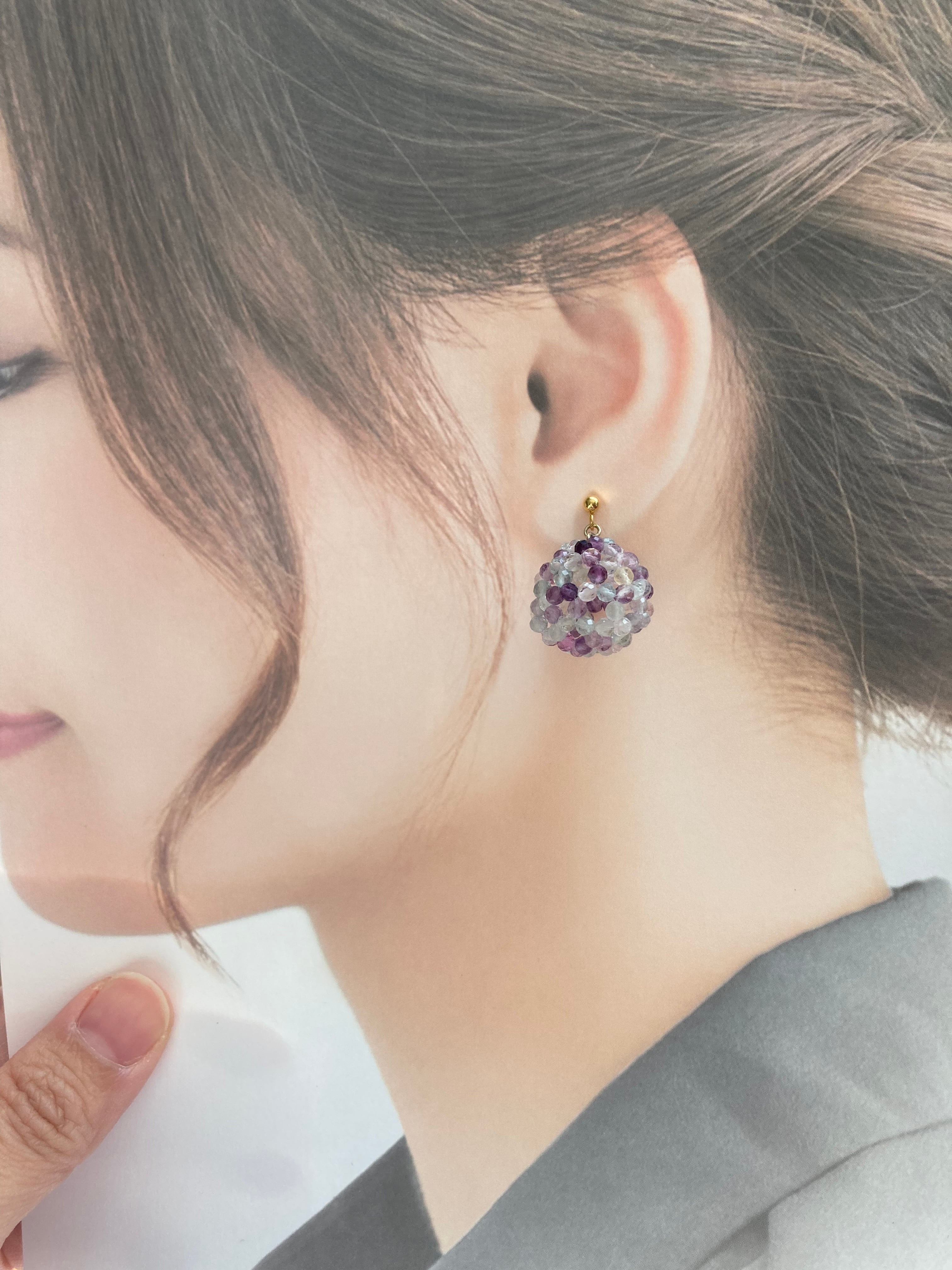 このマルチカラーの組み合わせがとっても絶妙で大好きな作品のひとつです。カットが入っていて90粒のフローライトが一粒一粒、光に反射して輝きます。両耳で180粒!