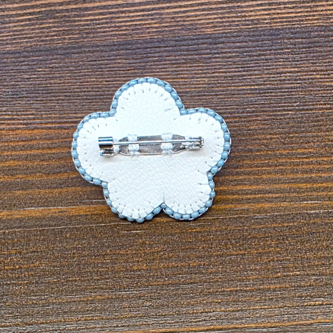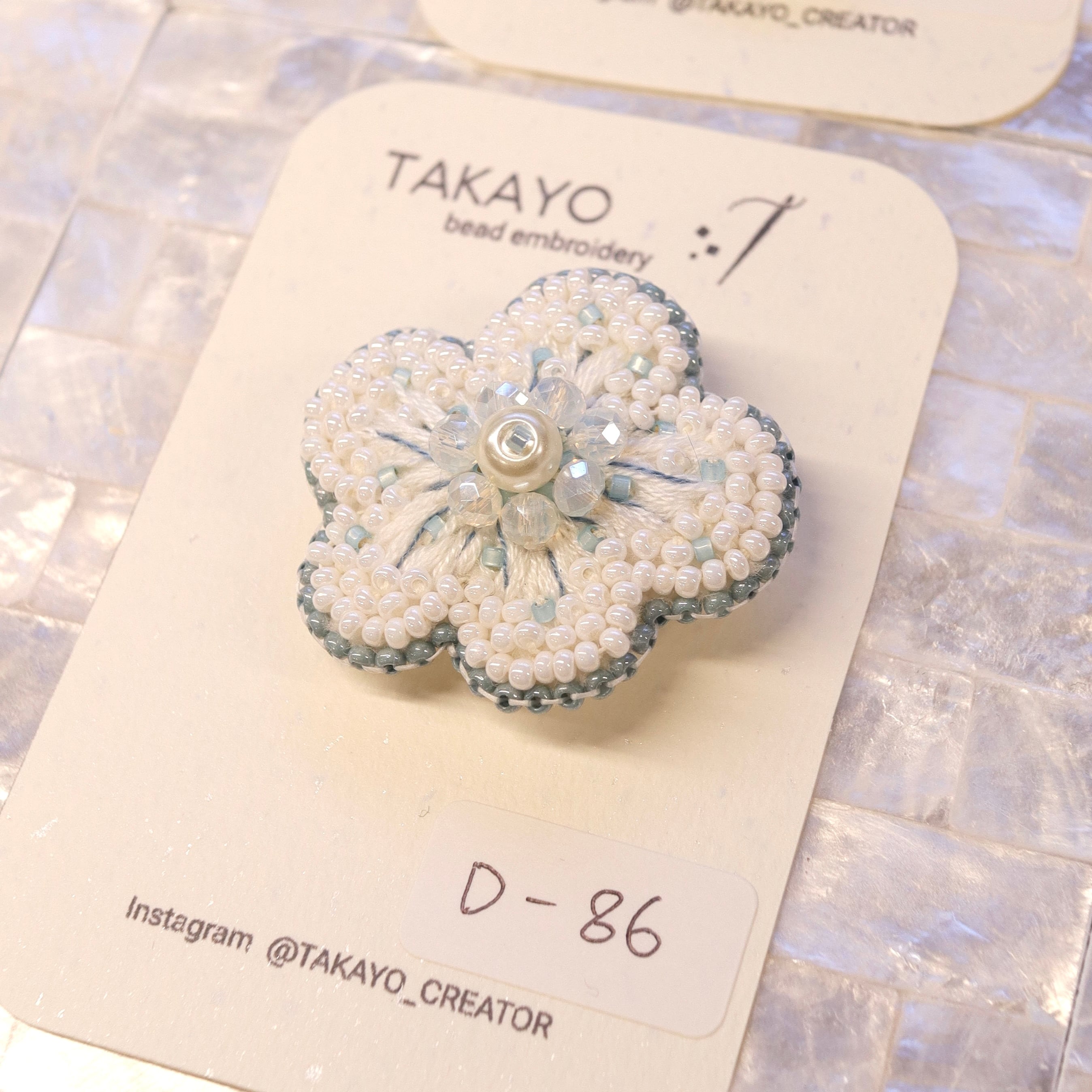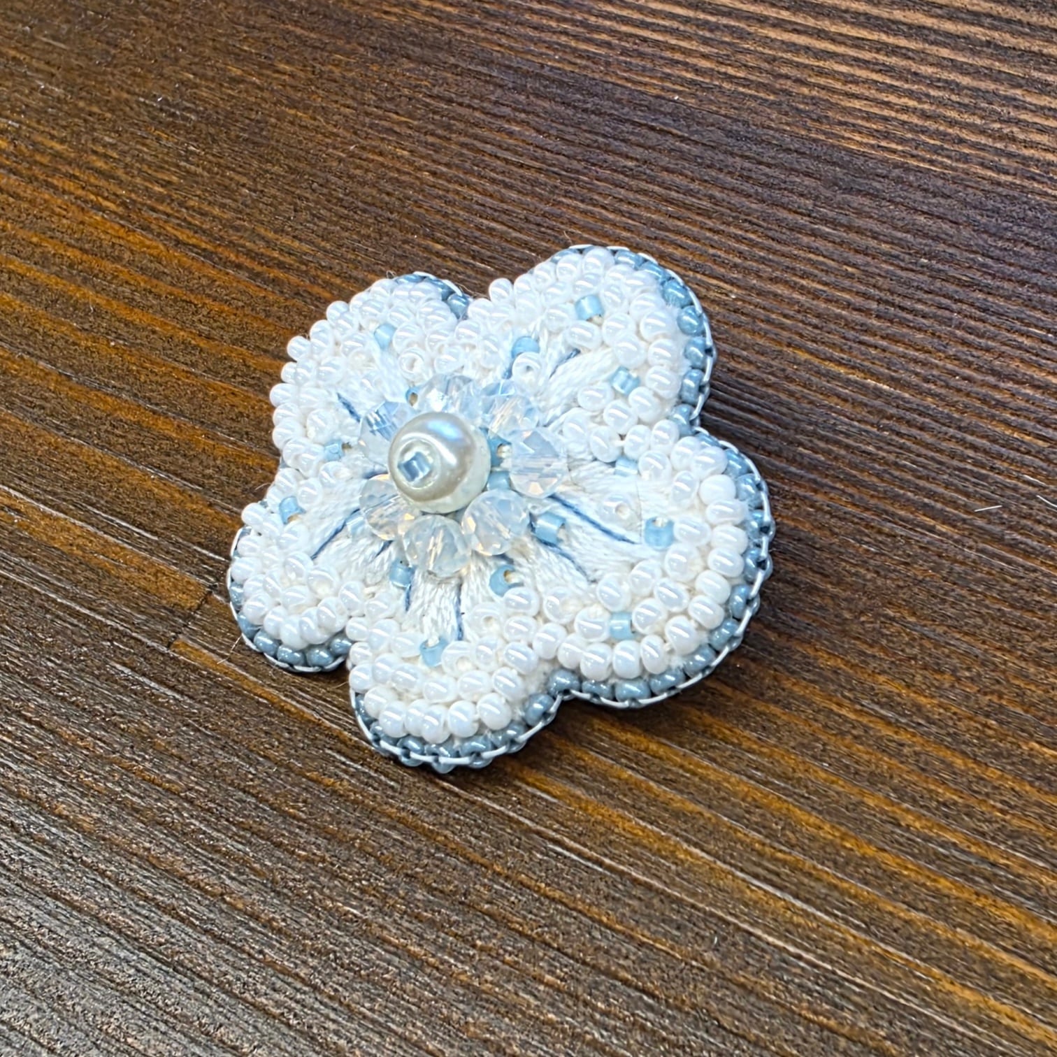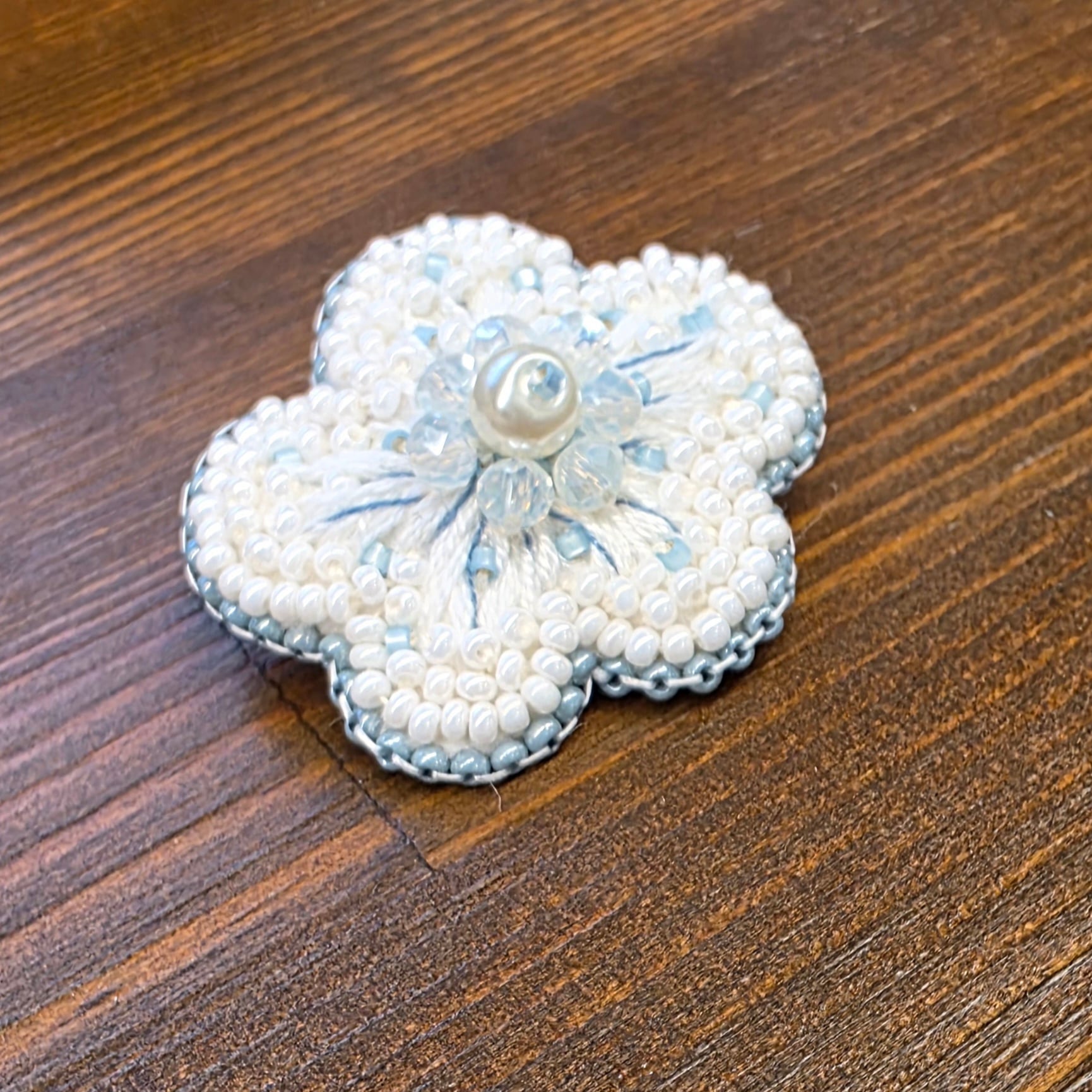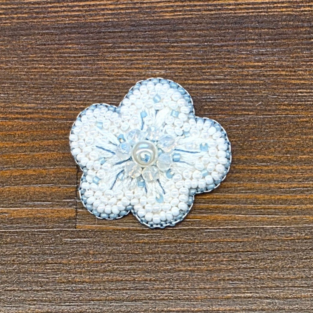 お花は刺繍糸とビーズを使い、真ん中にはパール、囲むようにカットガラスを配置しました。光の反射できらきらします。