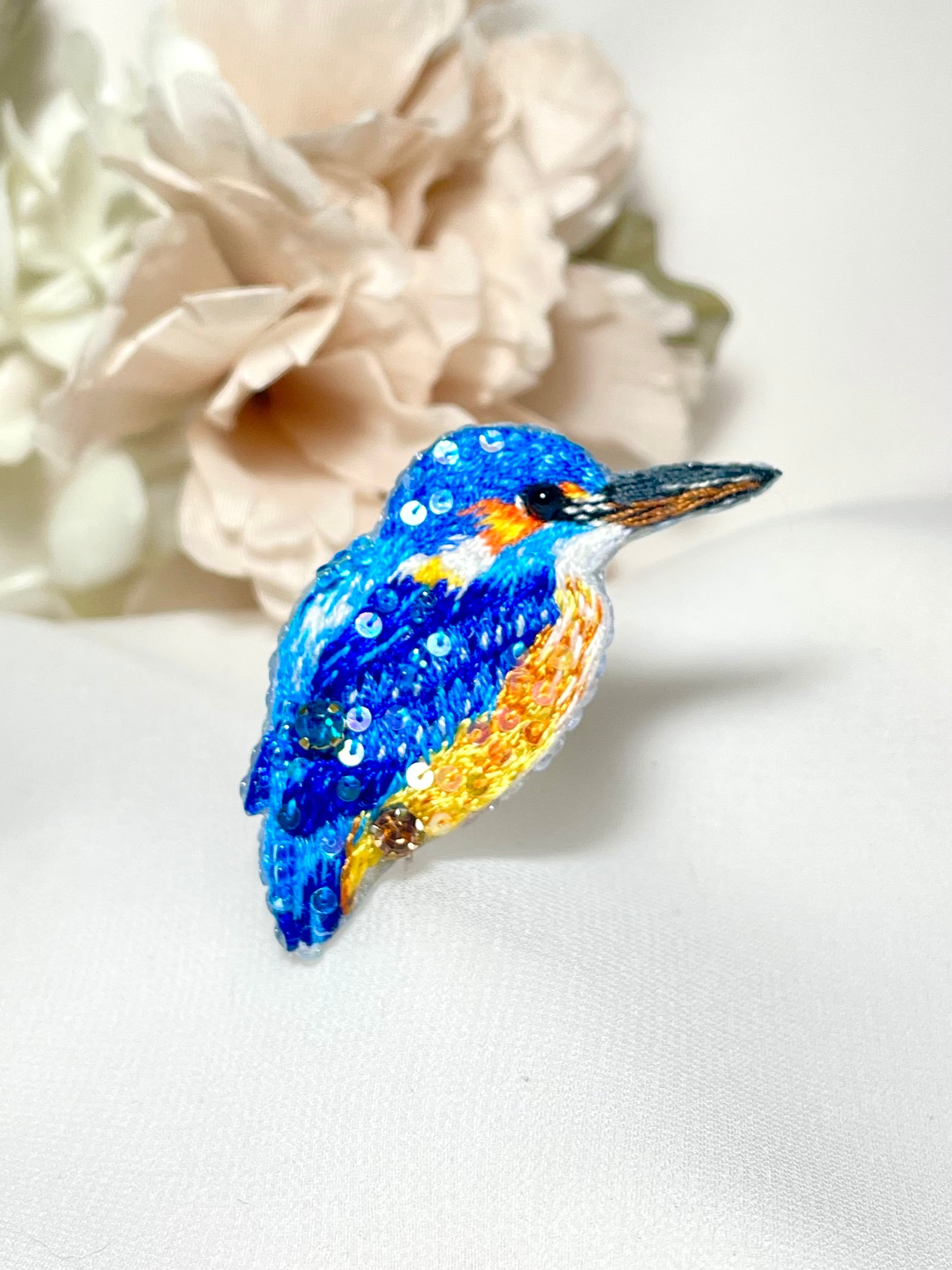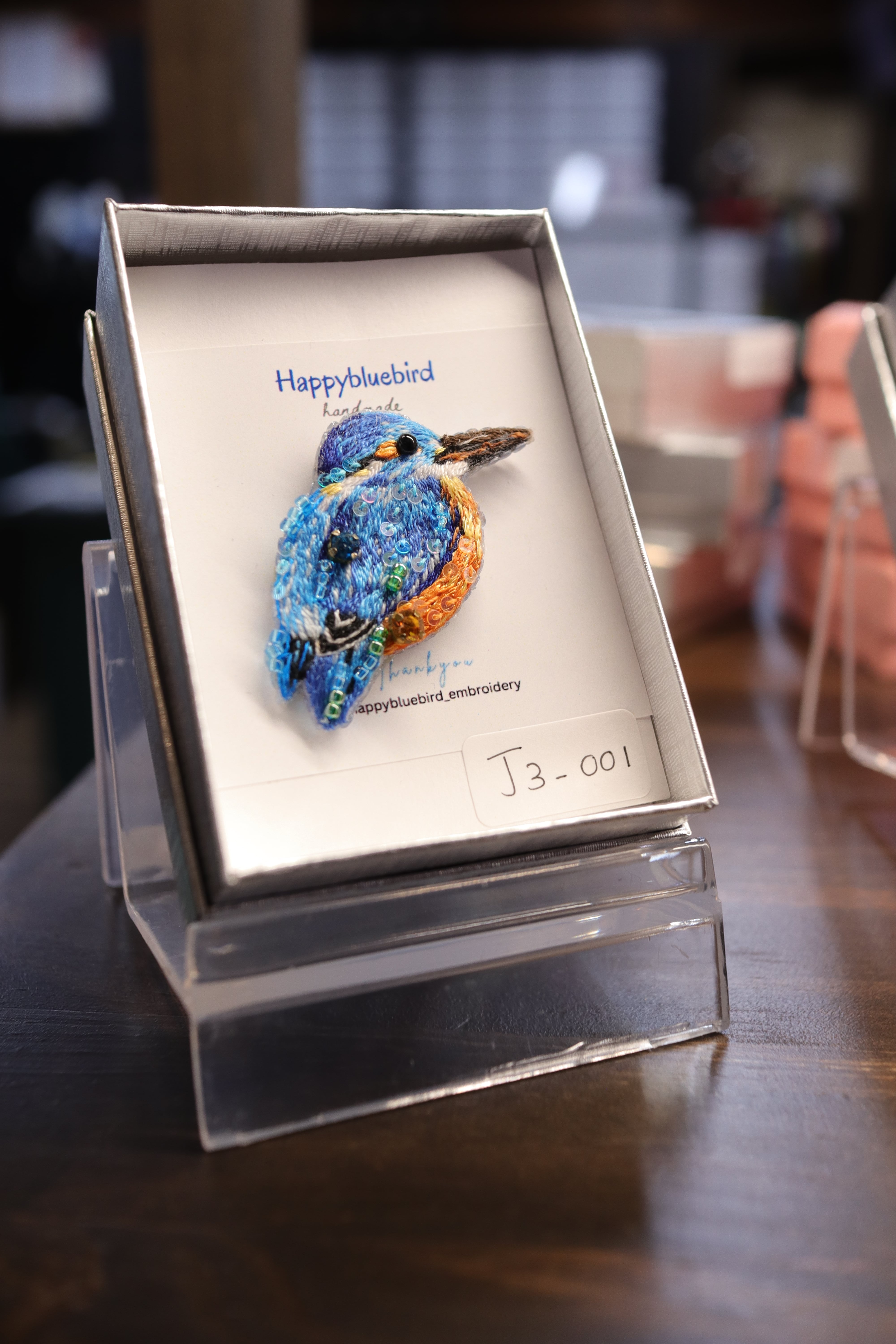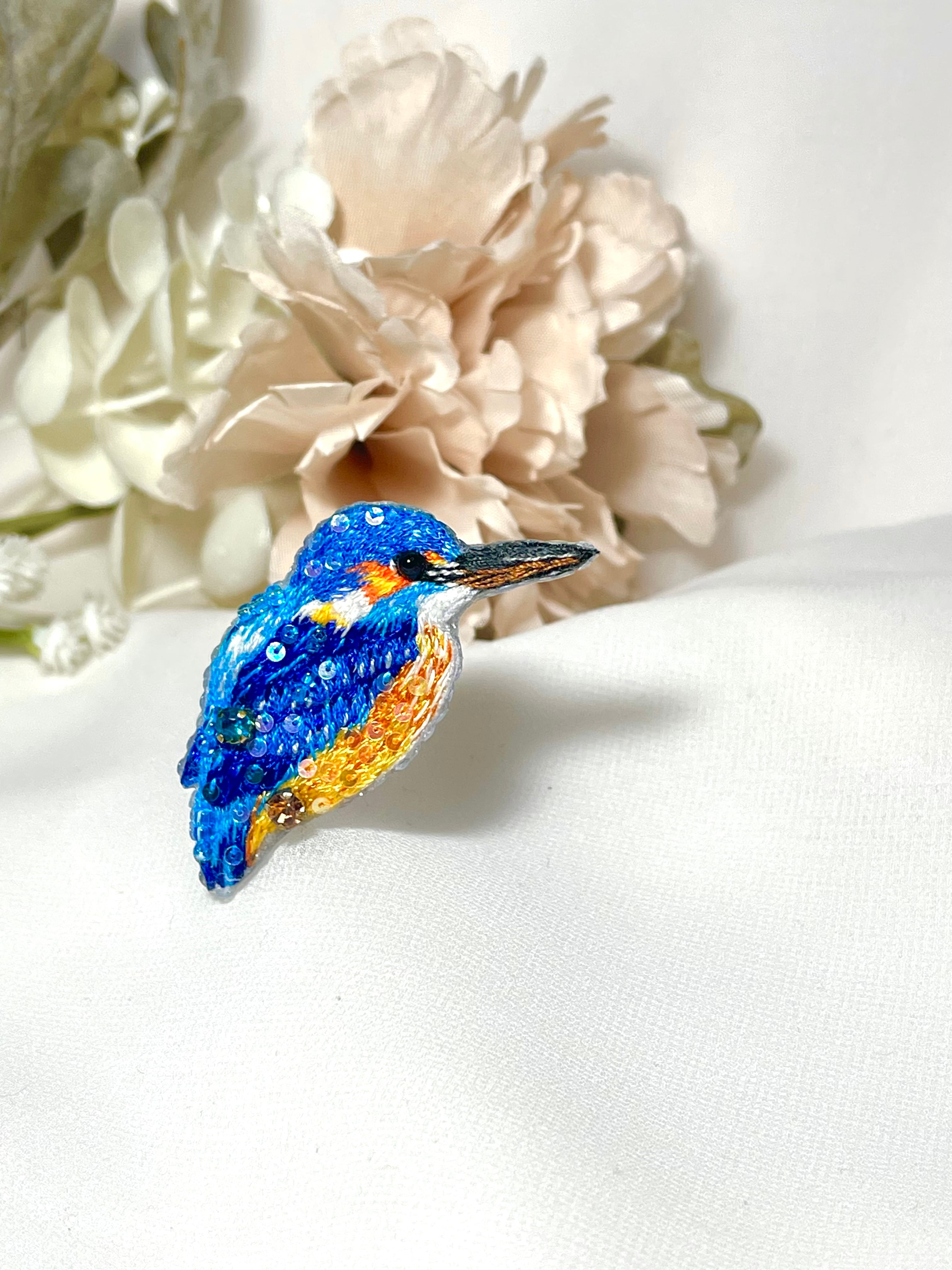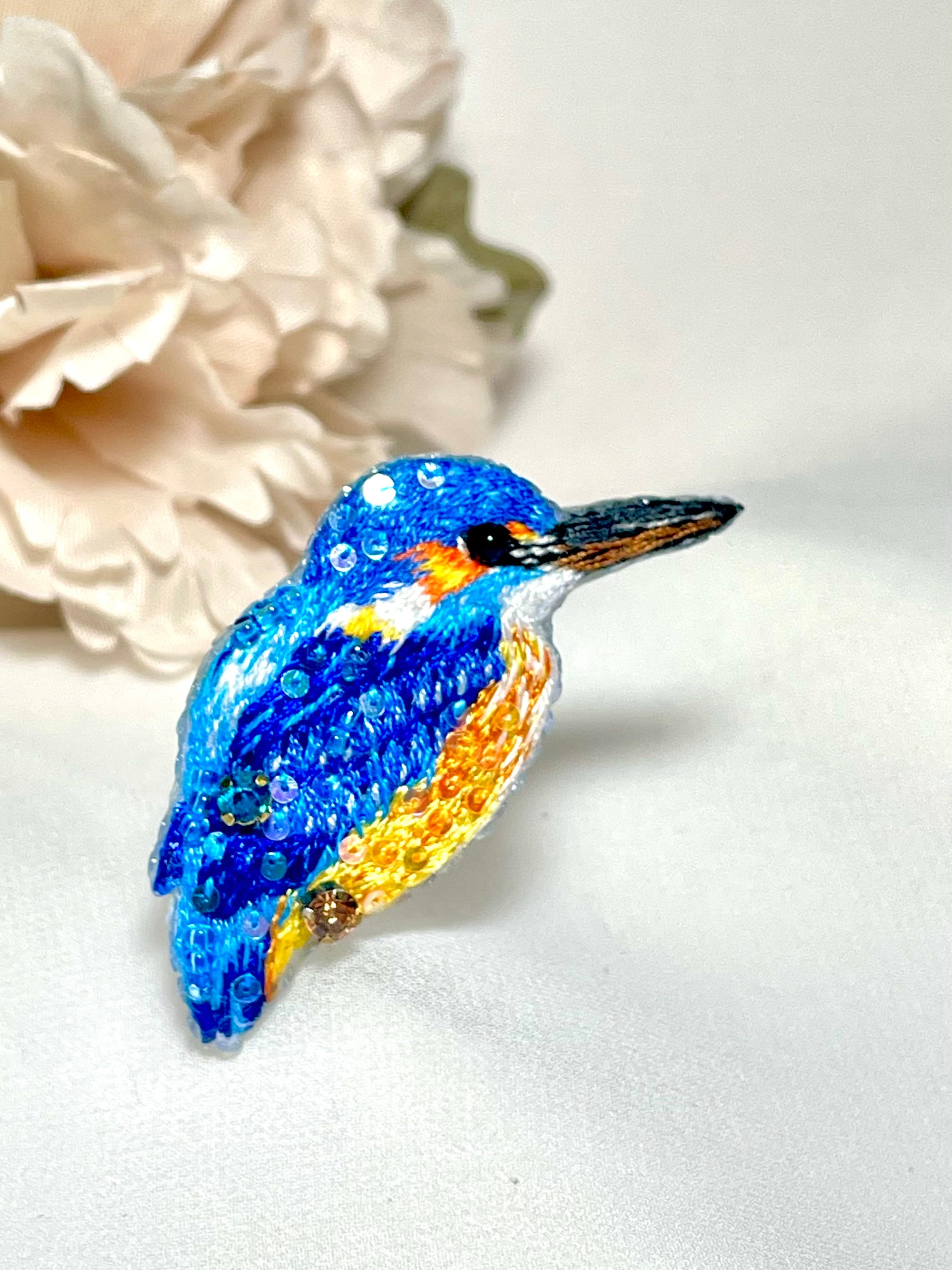 ひと針ひと針、ていねいに刺繍した小鳥のブローチです。