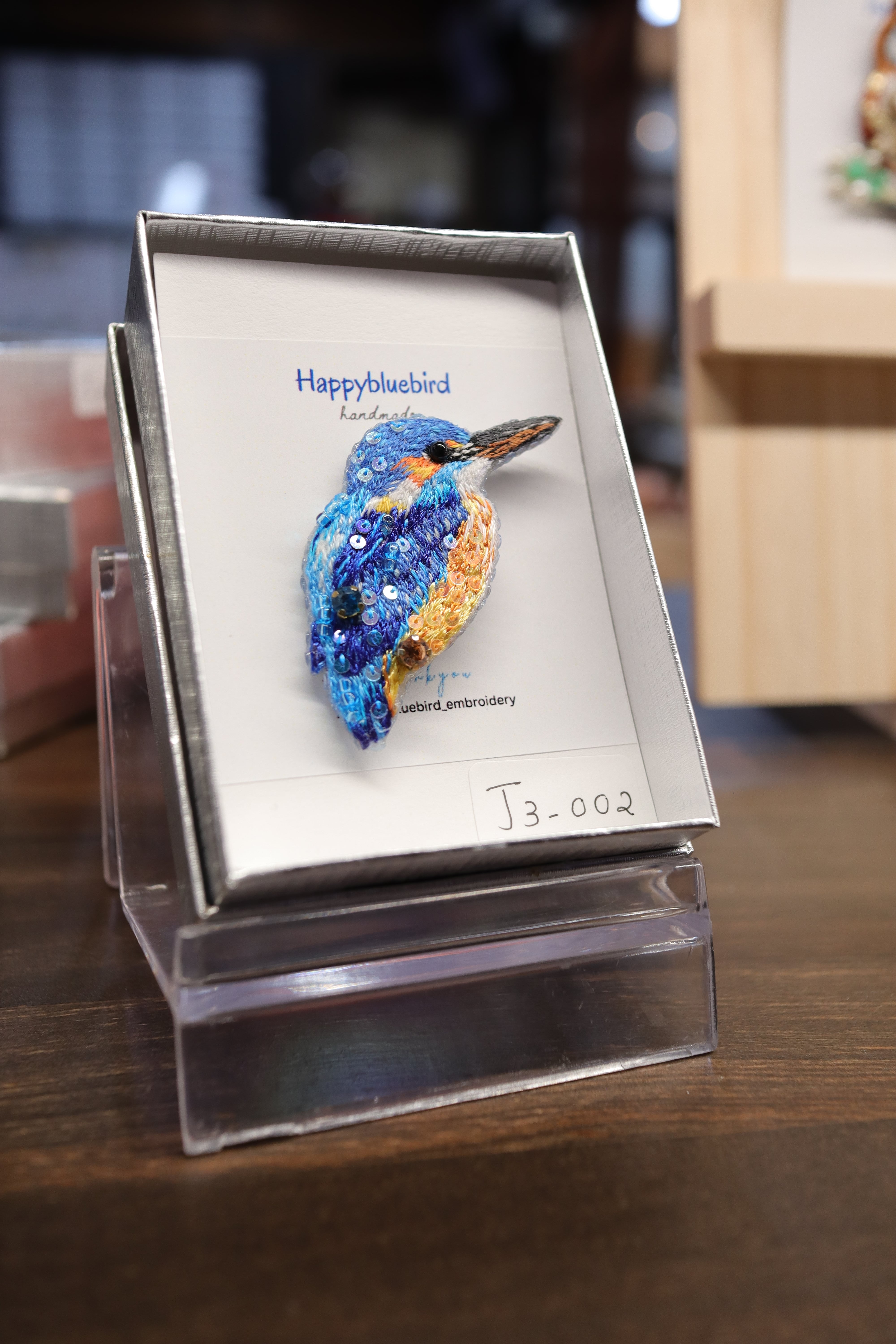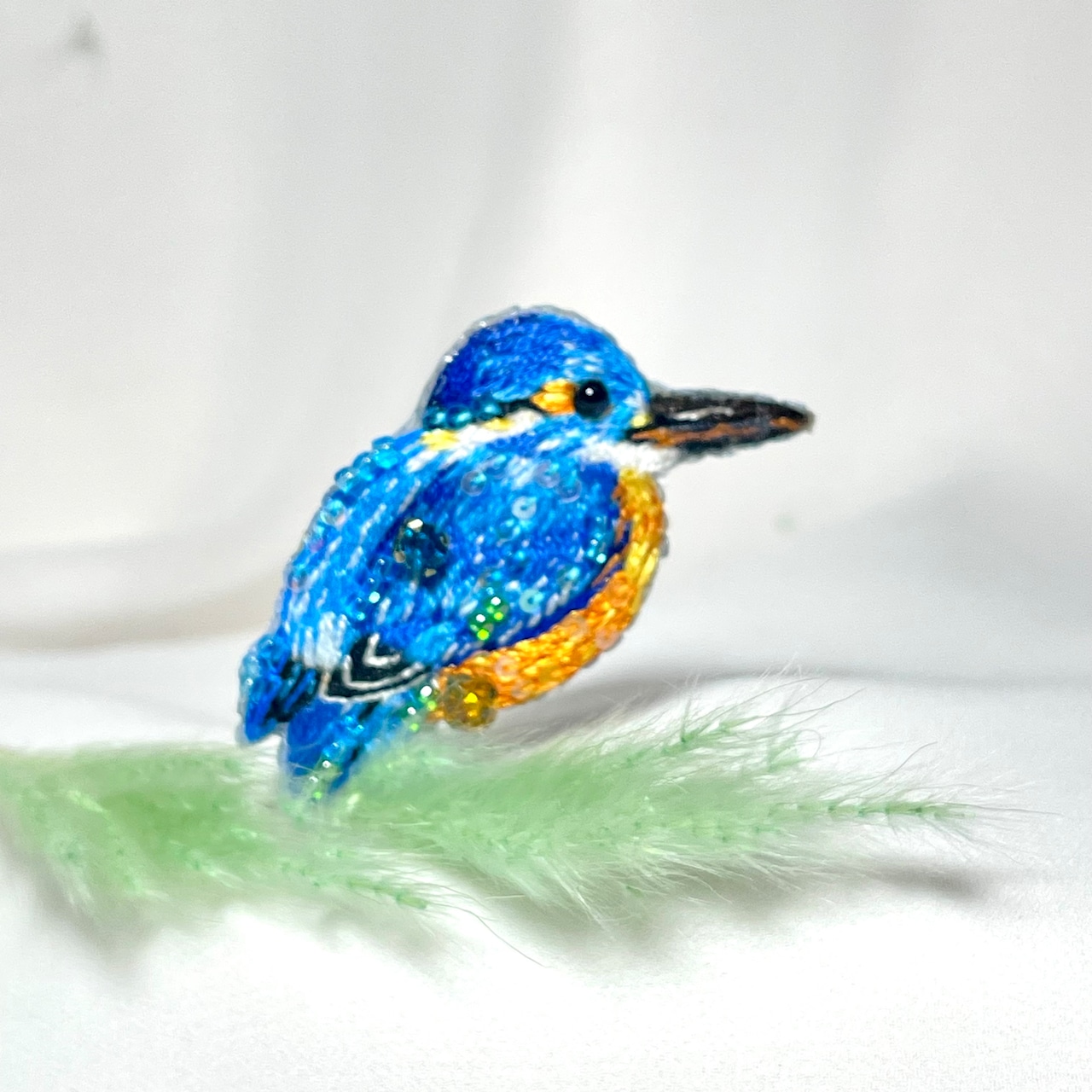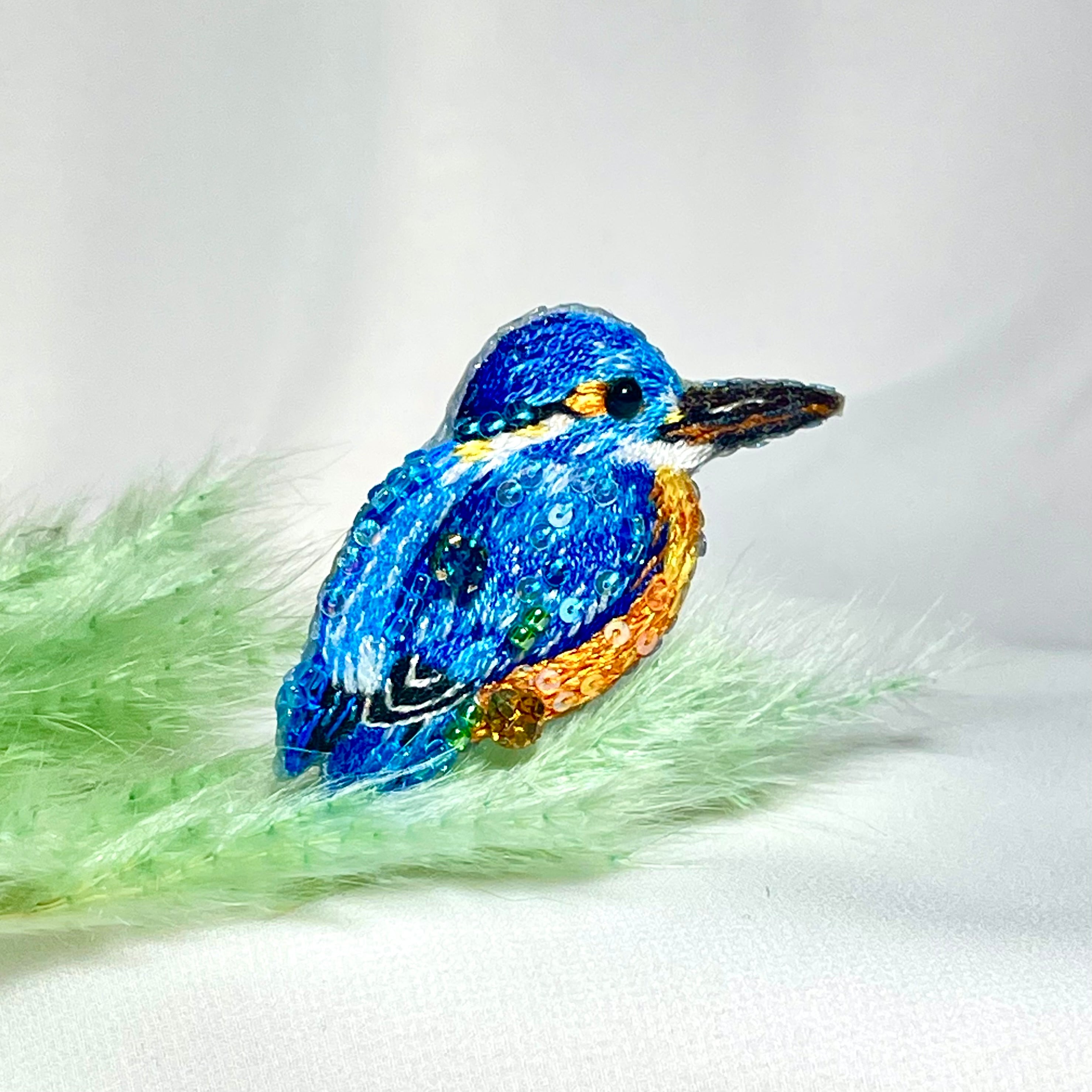 ひと針ひと針、ていねいに刺繍した小鳥のブローチです。