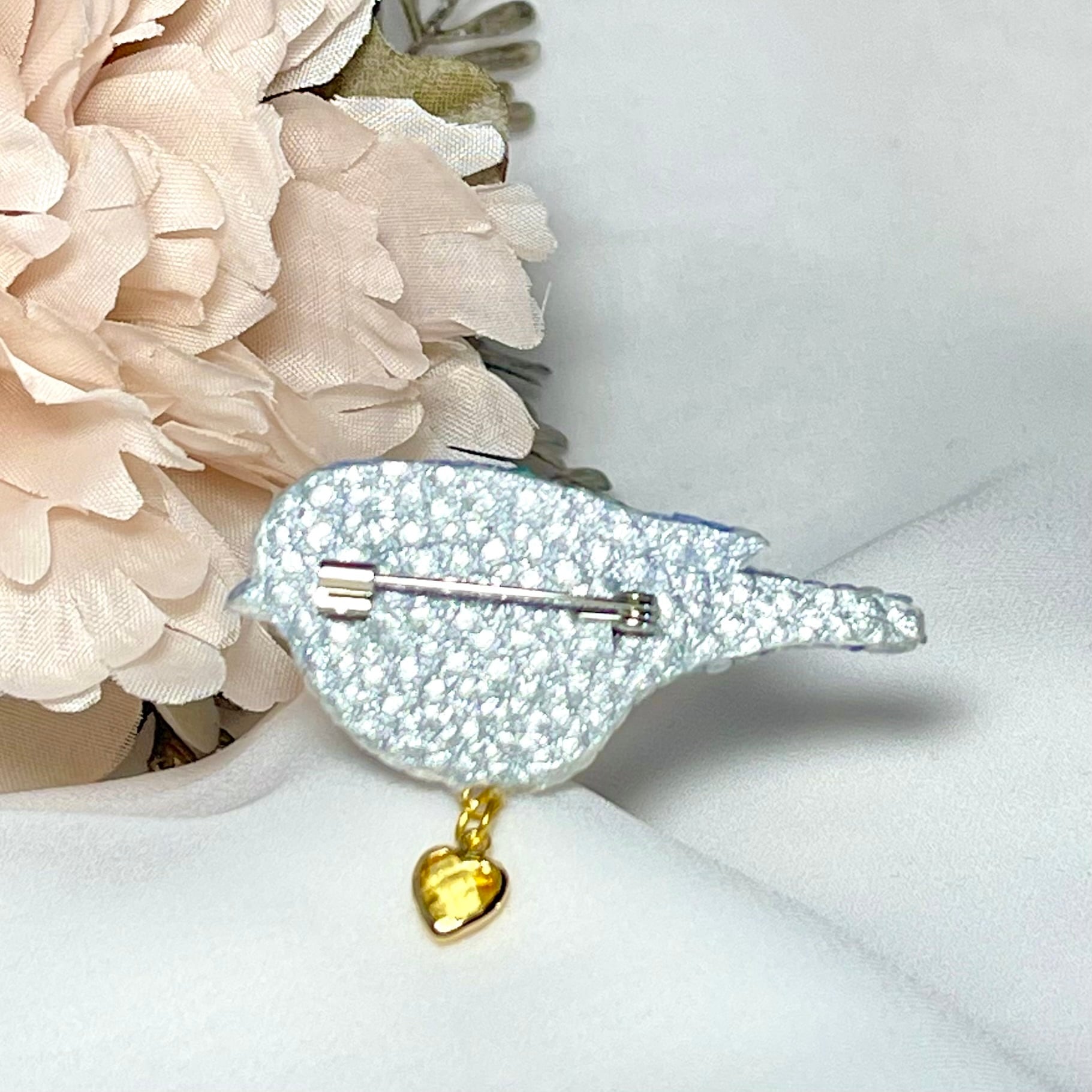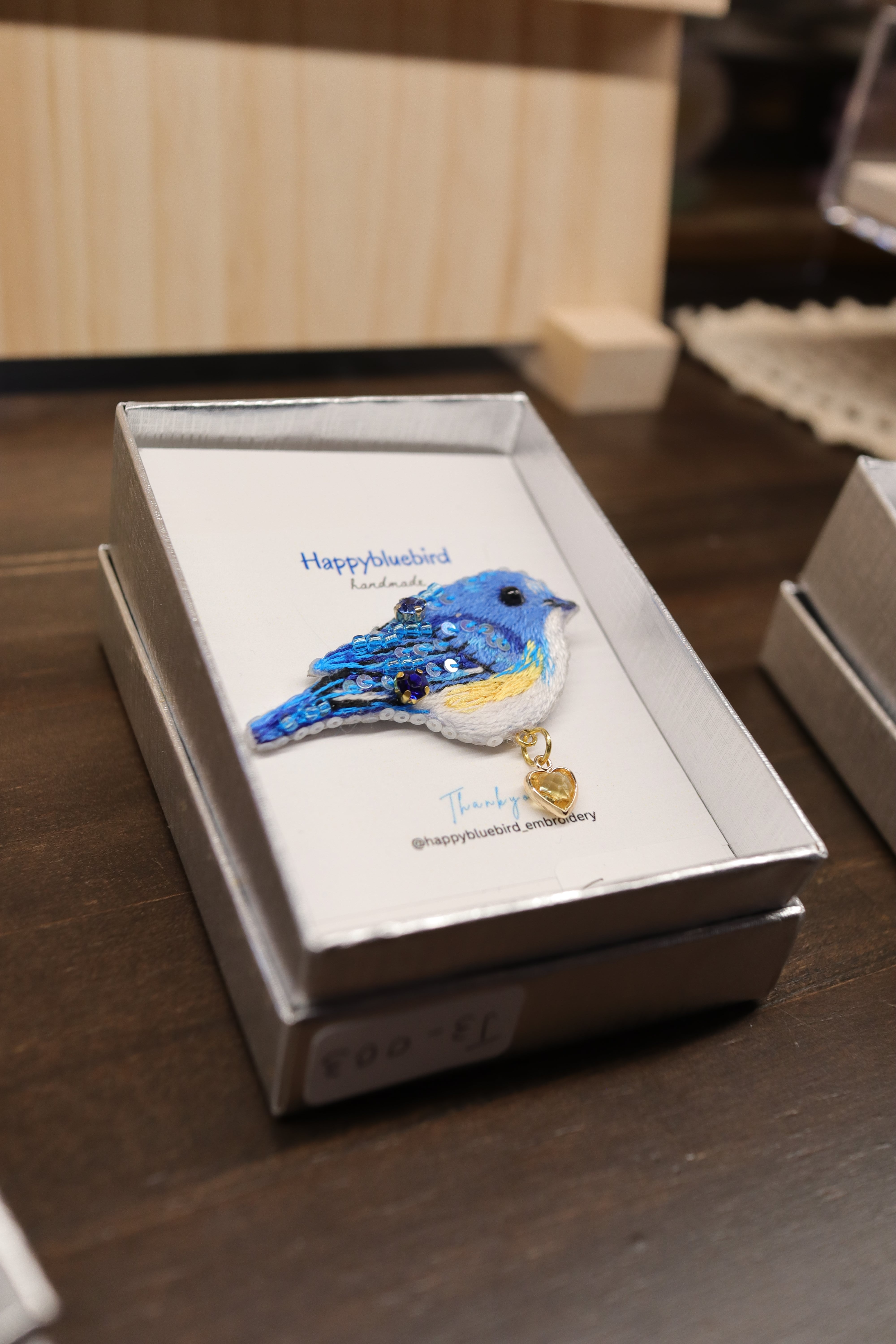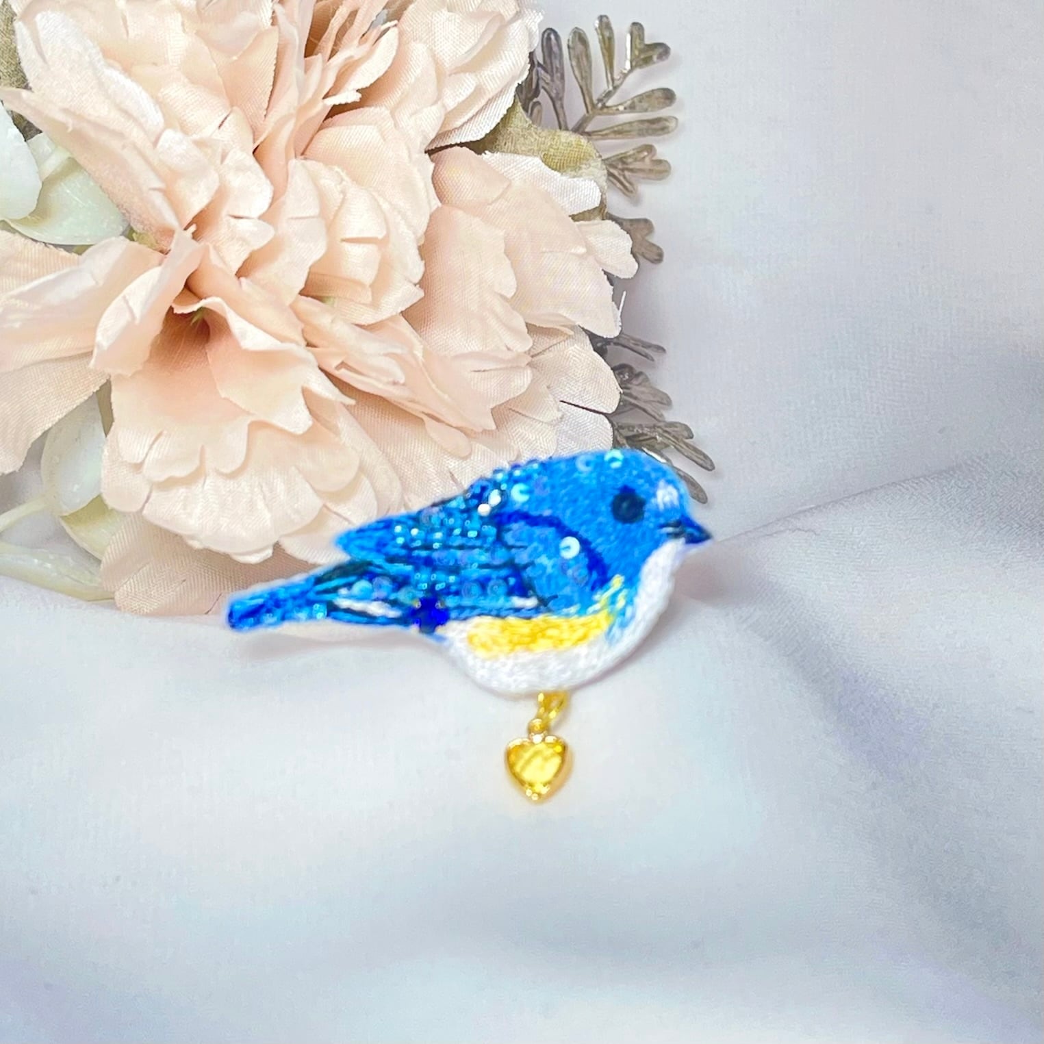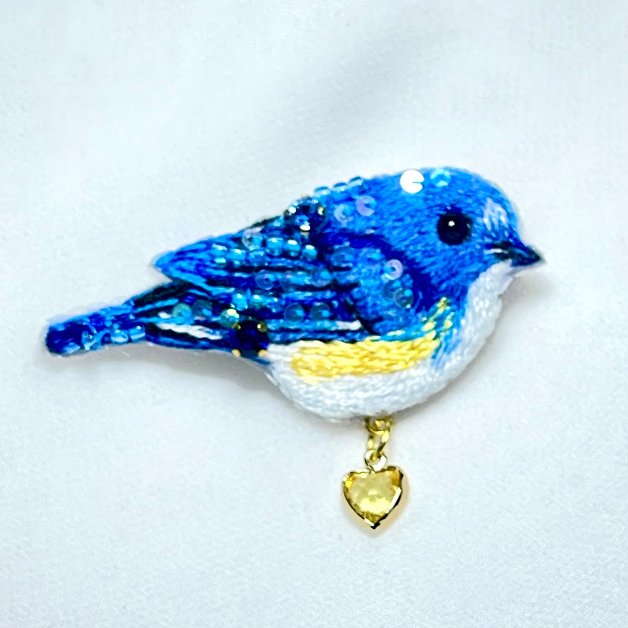 ひと針ひと針、ていねいに刺繍した小鳥のブローチです。