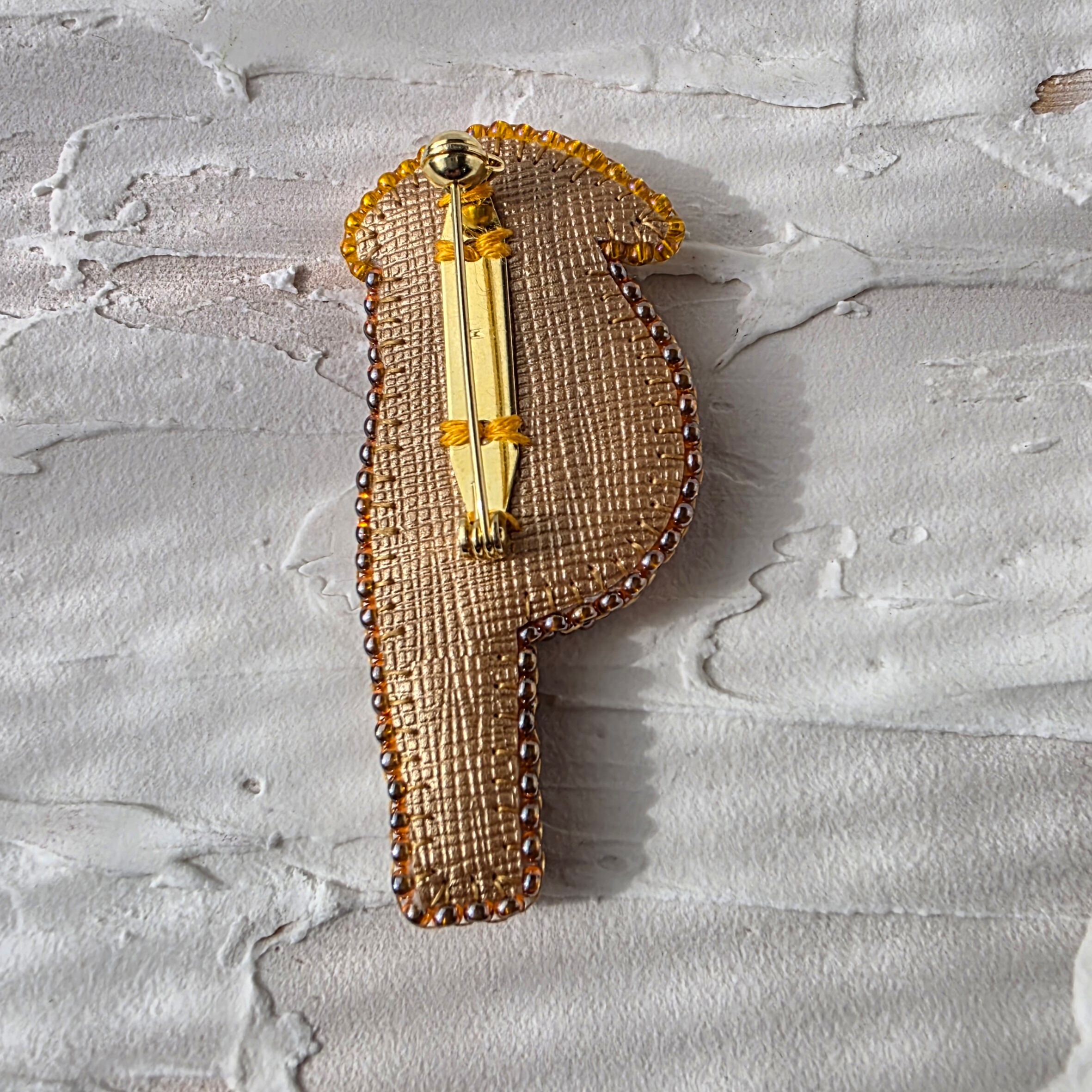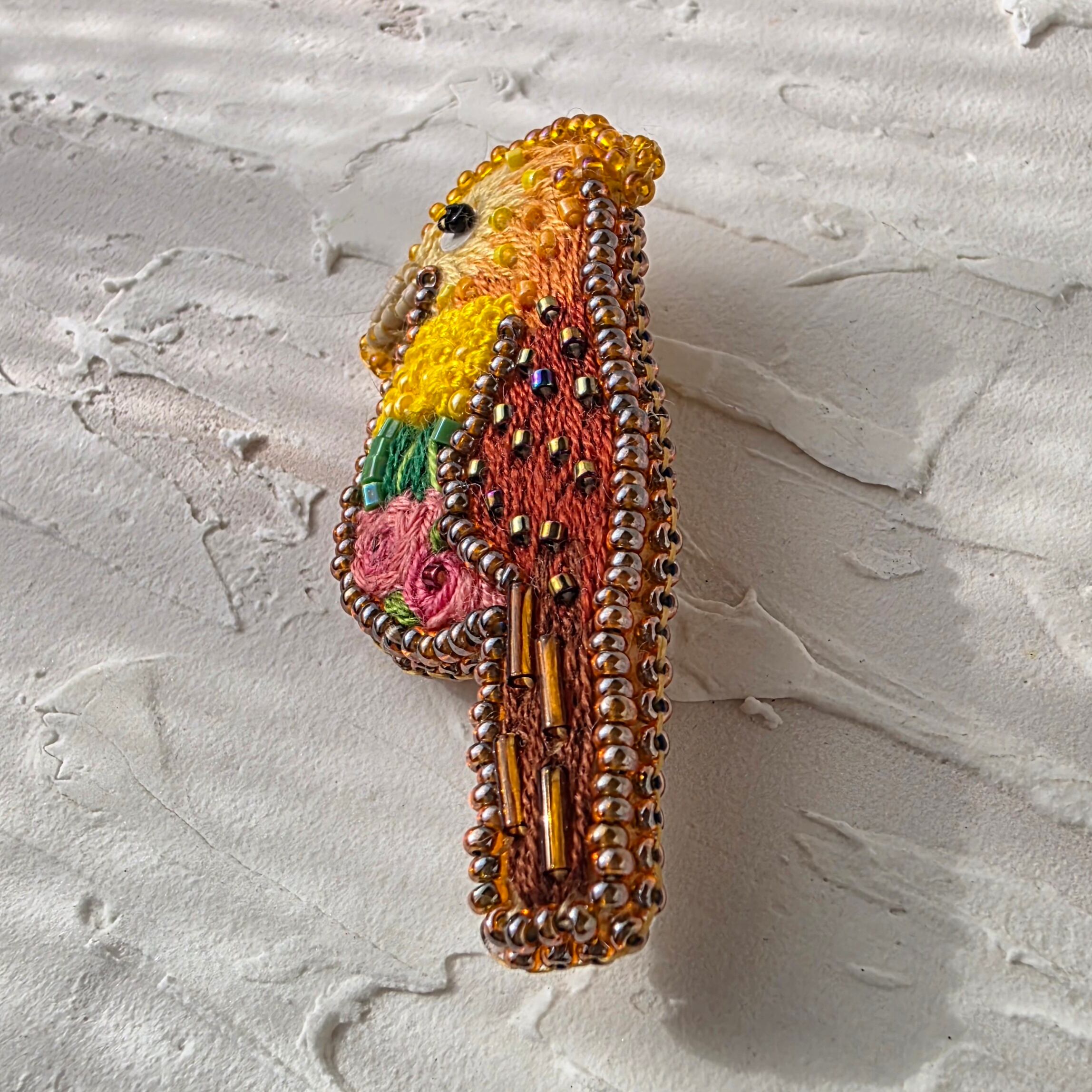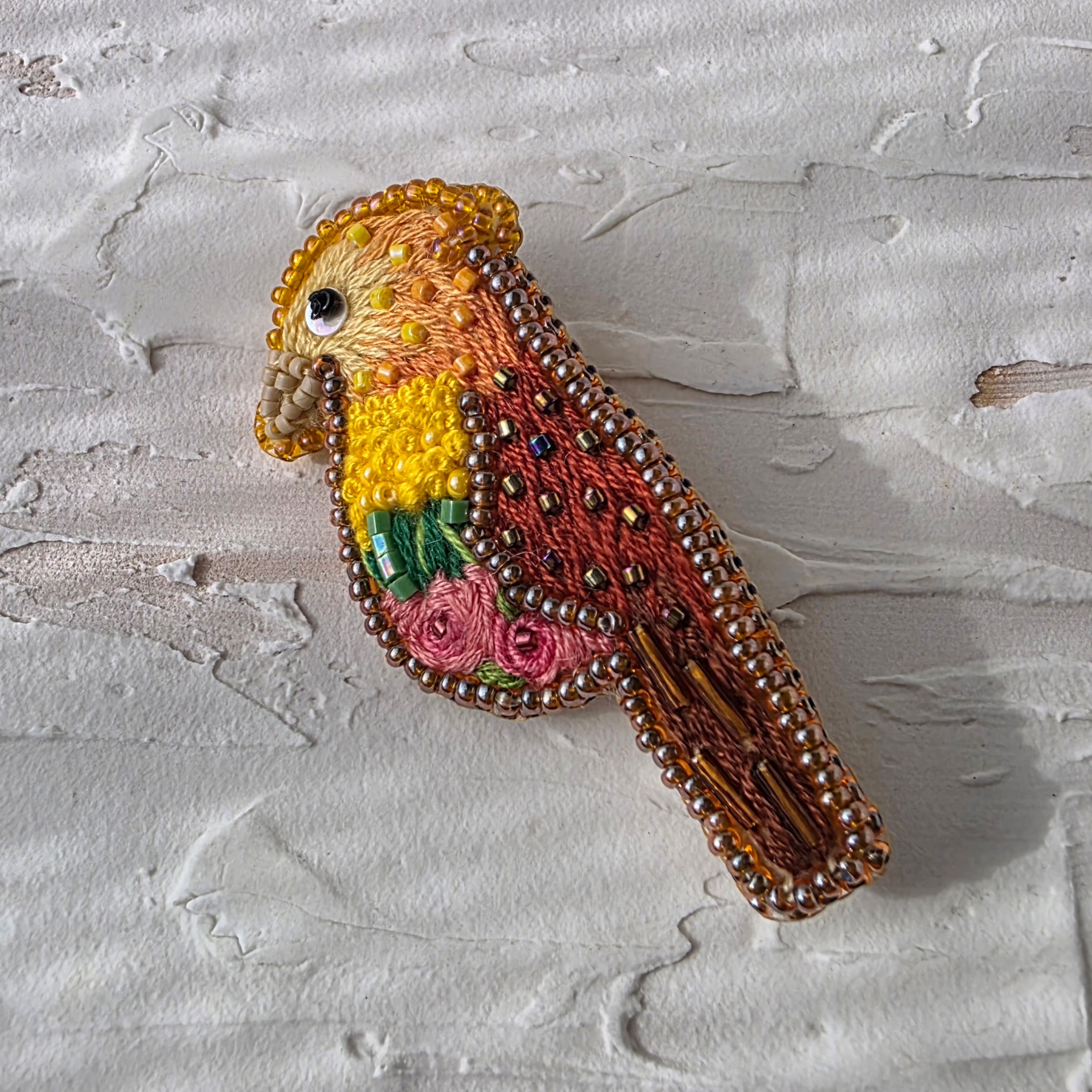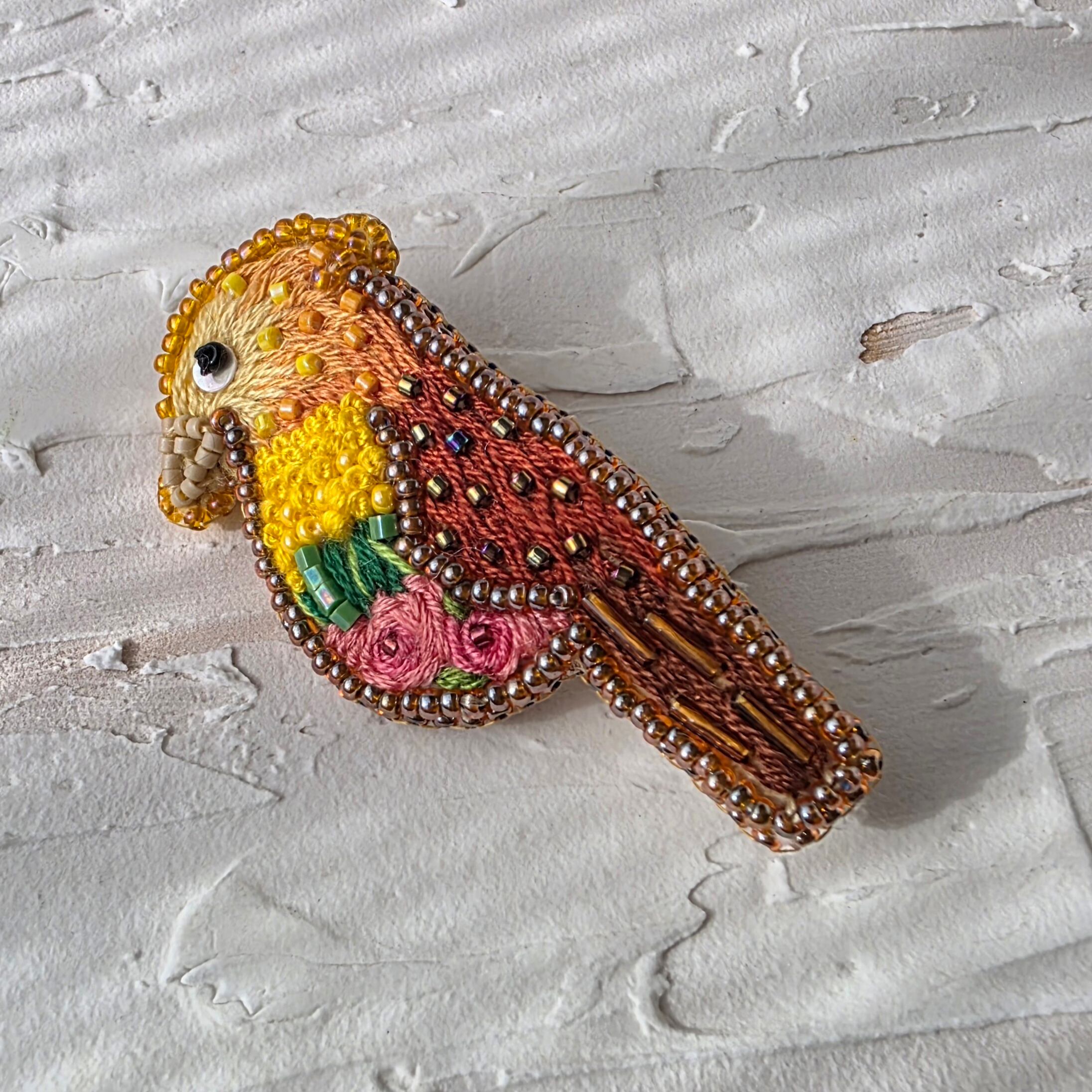 お腹部分がお花になっている鳥のビーズ刺繍ブローチです。