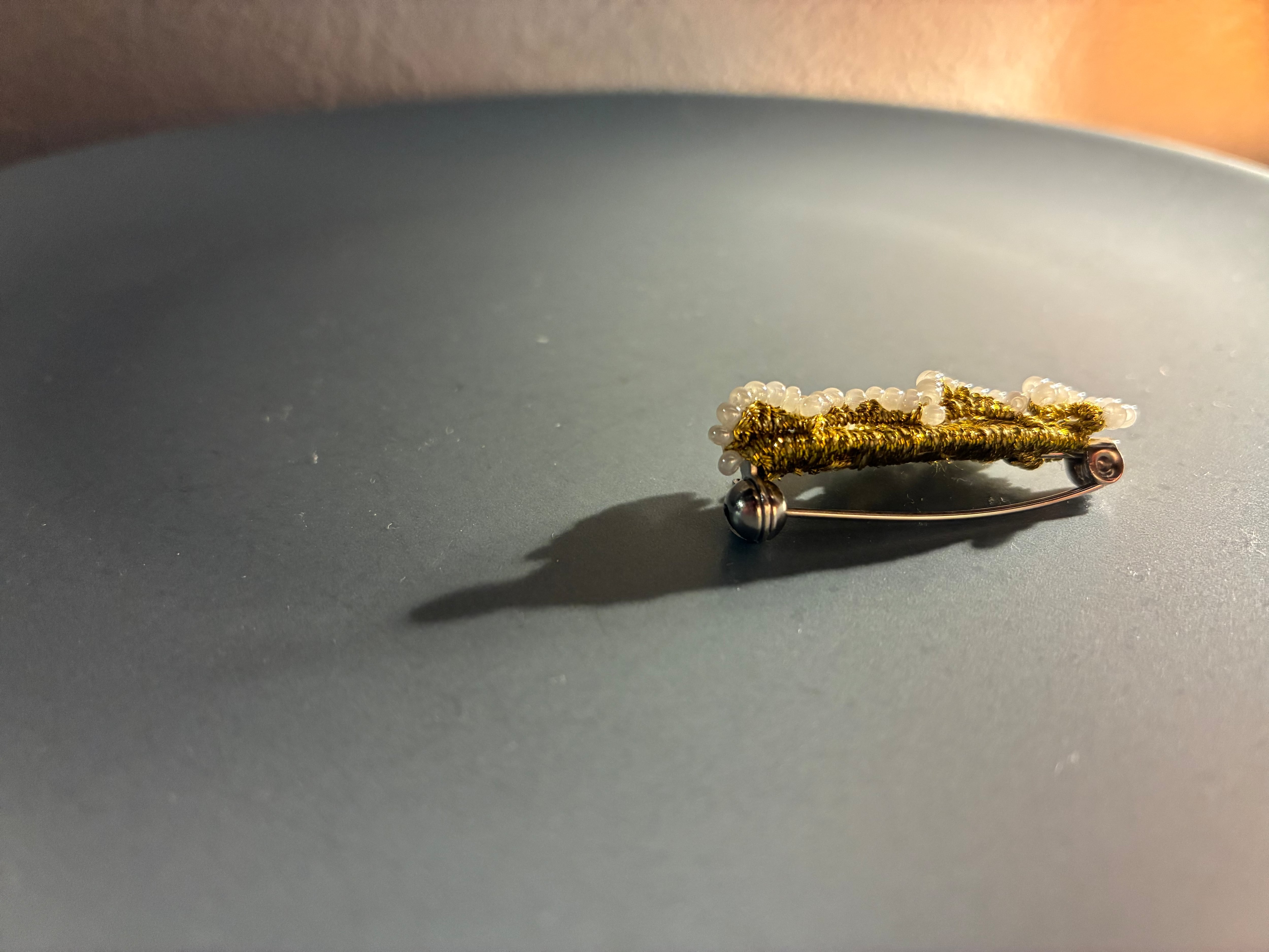 落ち着いたゴールドにパール調のホワイトガラスビーズを合わせています