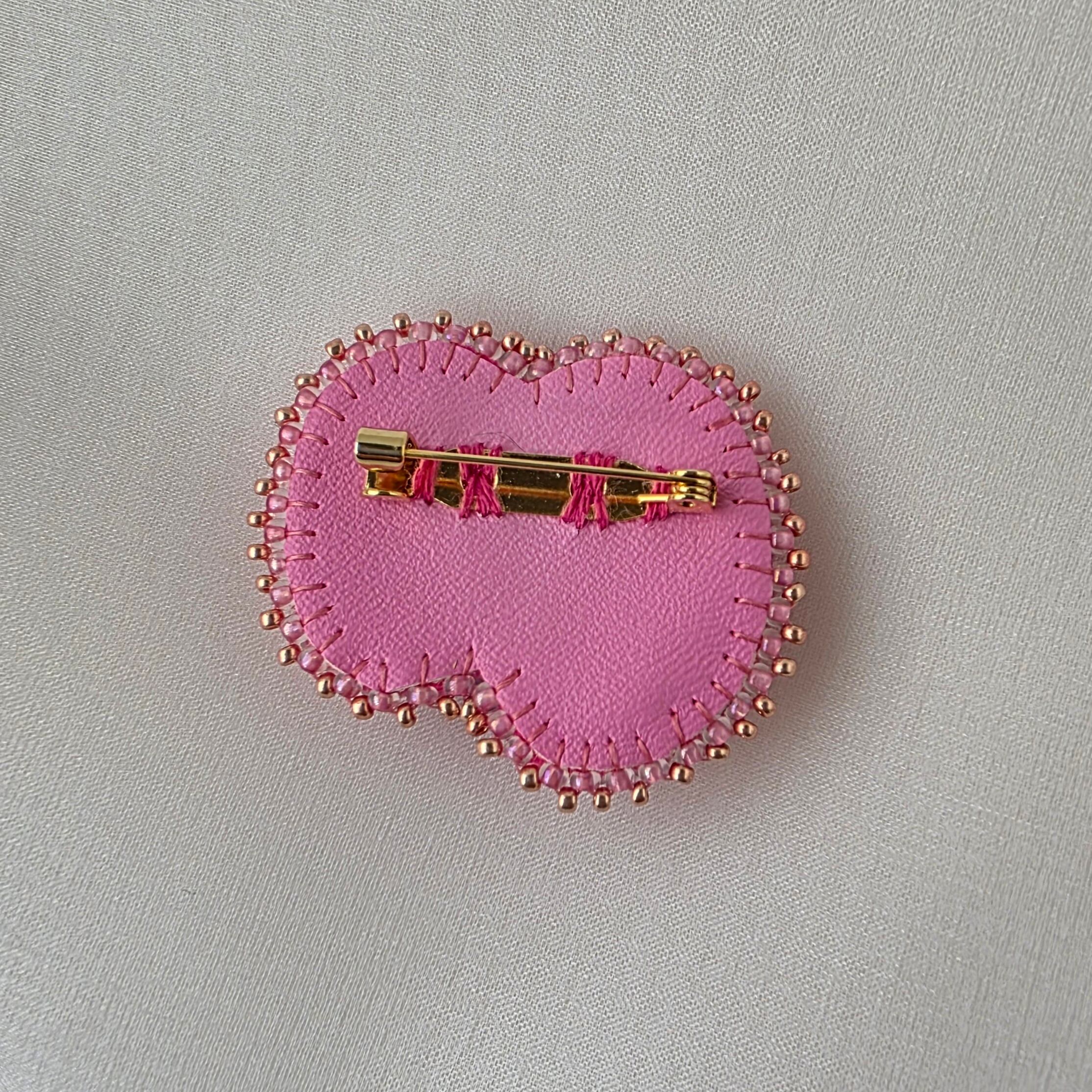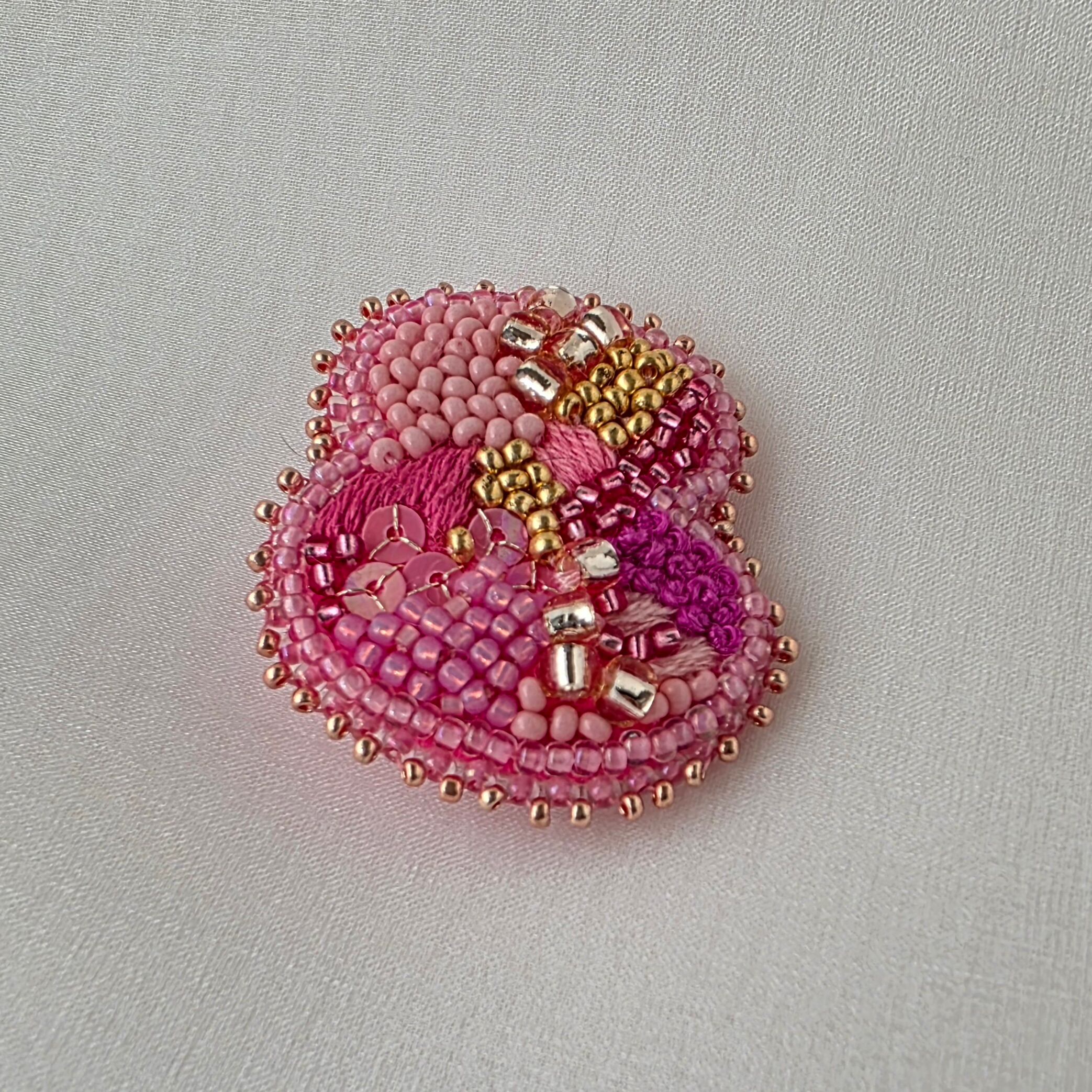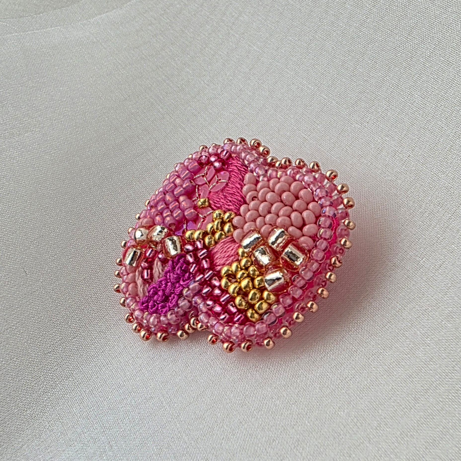 ピンクとポイントに金色を使った少し個性的な形のビーズ刺繍のブローチ です。