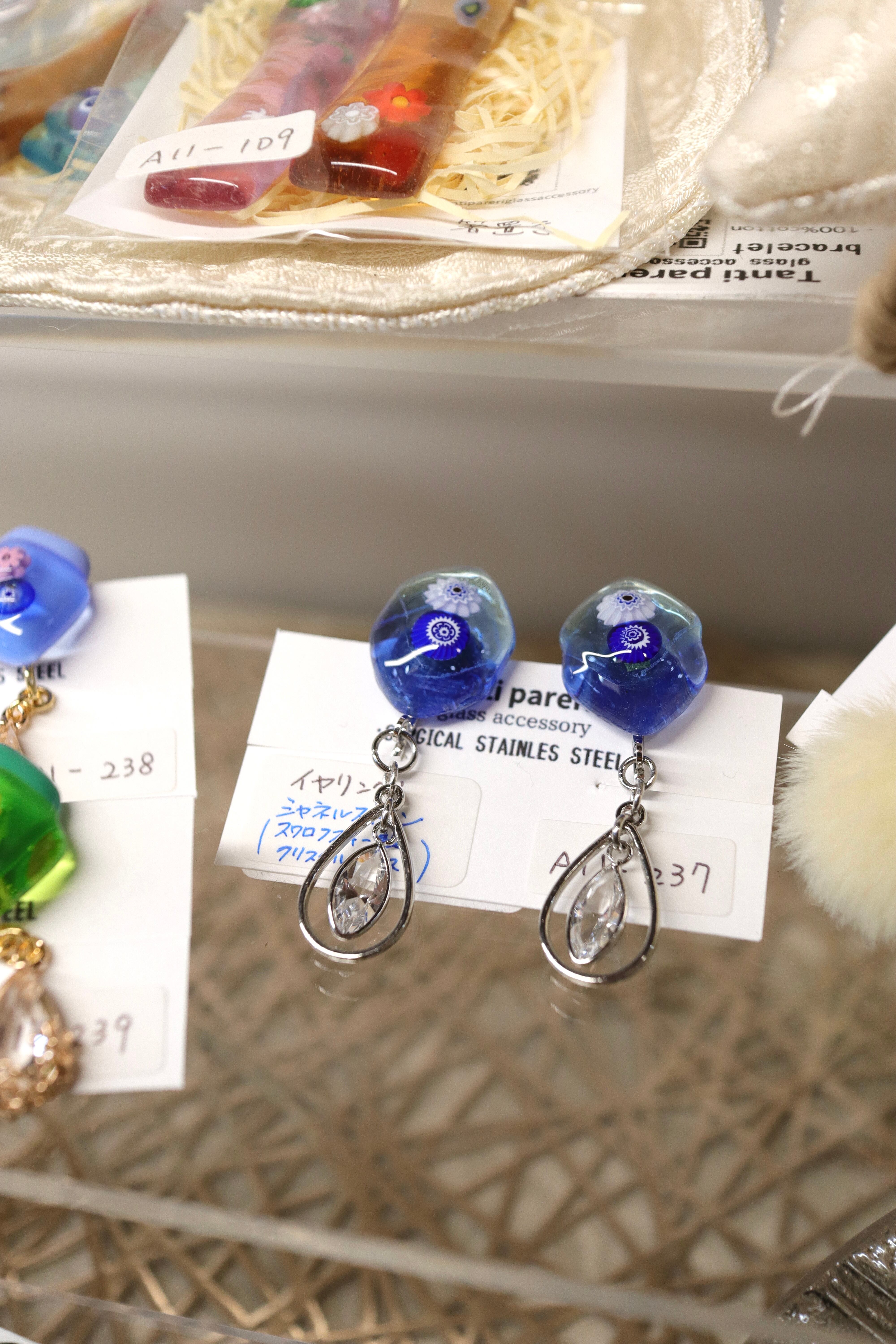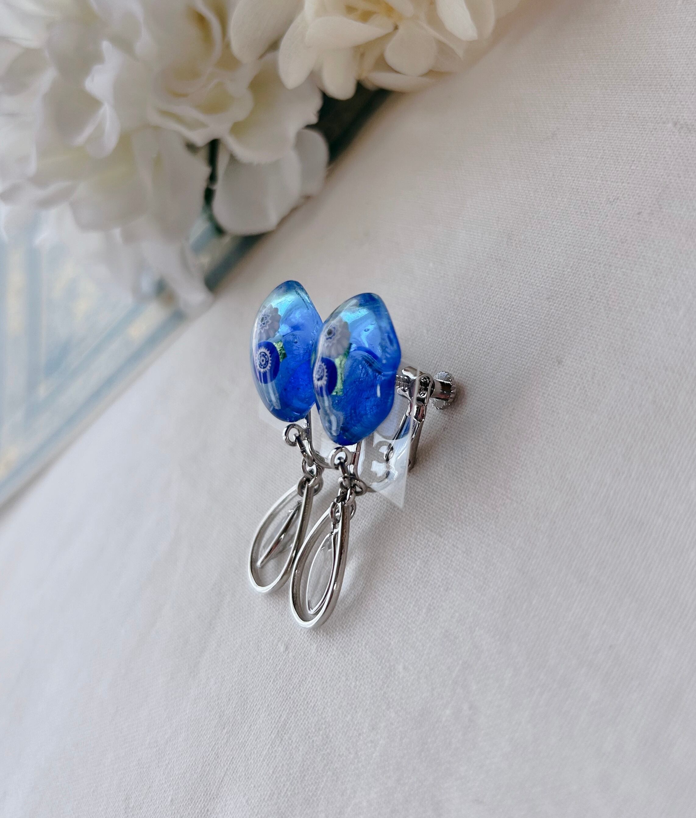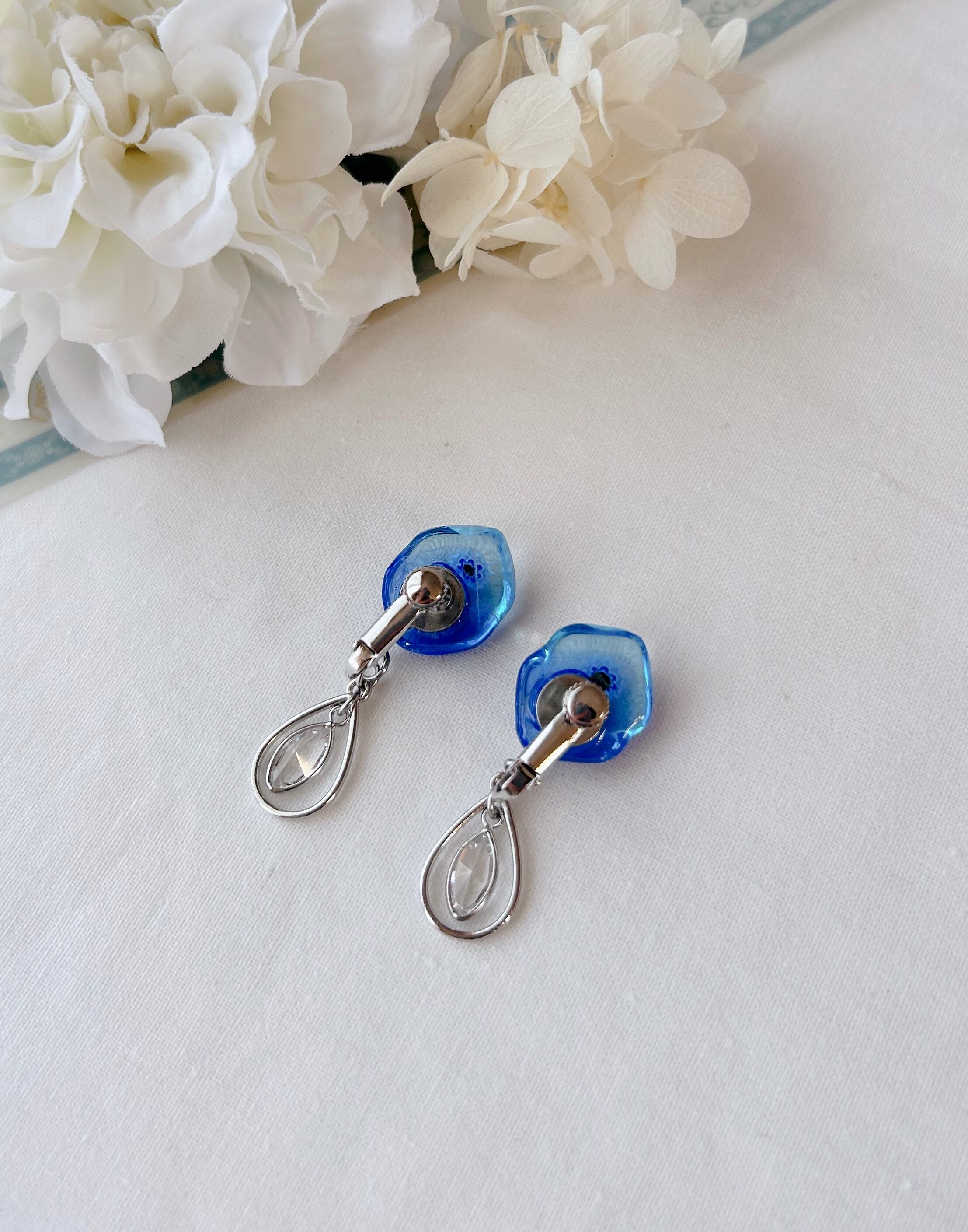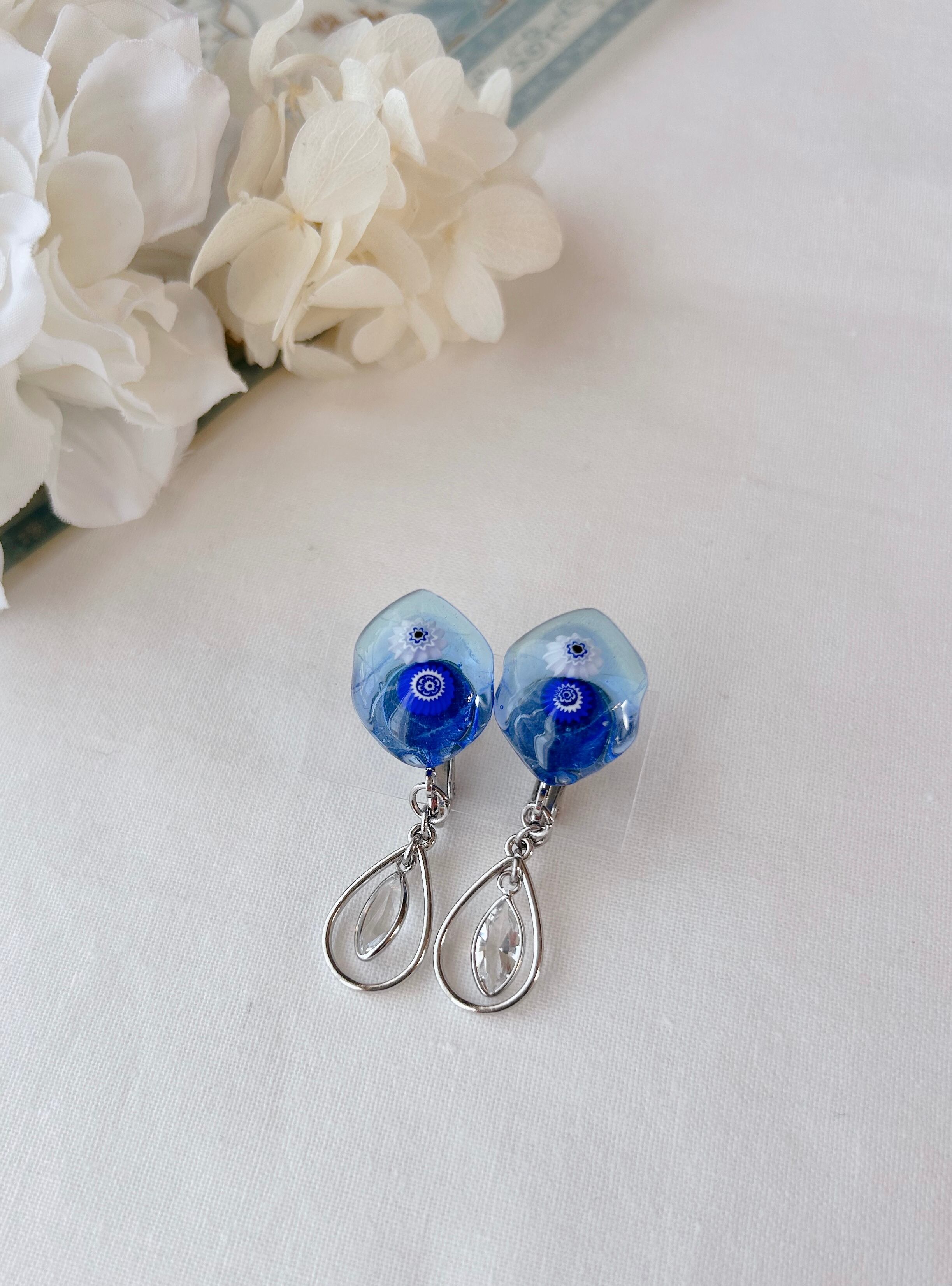 透明な水面の奥に広がる深いブルーのようなガラスと可憐に浮かぶ花模様のガラス。そっと揺れる雫パーツが清楚なコーデにぴったりです。